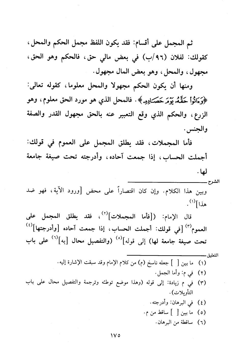 قال الإمام: ([فأما المجملات]، فقد يطلق المجمل على العموم [في قولك: أجملت الحساب، إذا جمعت آحاد [وأدرجتها] تحت صيغة جامعة لها) إلى فقوله] (والتفصيل محال [به] على باب