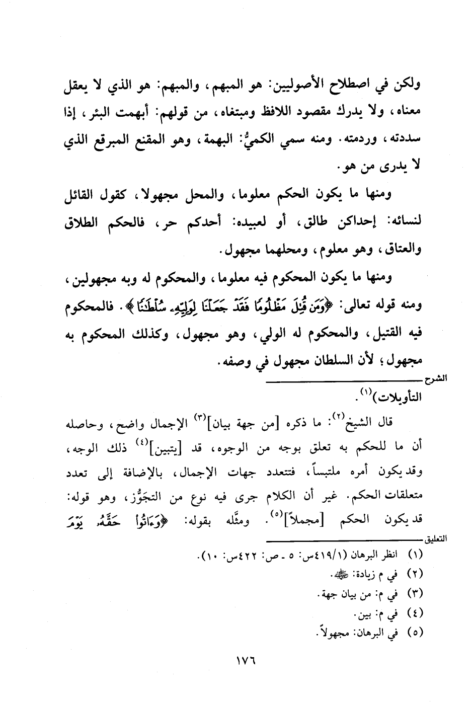 قال الشيخ: ما ذكره [من جهة بيان] الإجمال واضح، وحاصله أن ما للحكم به تعلق بوجه من الوجوه، قد [يتبين] ذلك الوجه، وقد يكون أمره ملتبسًا، فتتعدد جهات الإجمال، بالإضافة إلى تعدد متعلقات الحكم. غير أن الكلام جرى فيه نوع من التجوز، وهو قوله: قد يكون الحكم [مجملًا]. ومثله بقوله: {وءاتوا حقه يوم