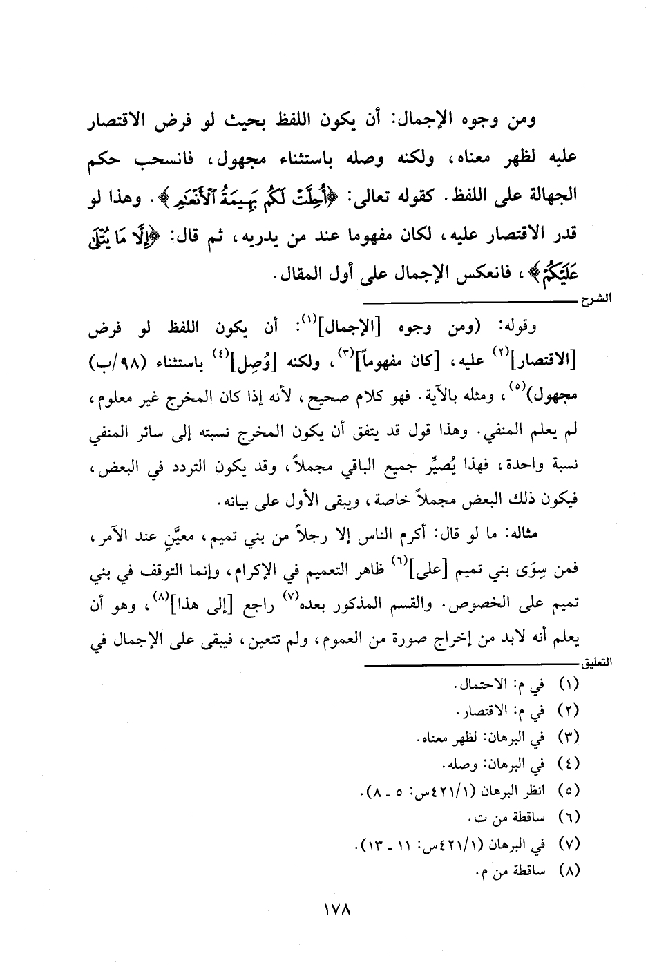 وقوله: (ومن وجوه [الإجمال]: أن يكون اللفظ لو فرض [الاقتصار] عليه، [كان مفهومًا]، ولكنه [وصل] باستثناء (٩٨/ب) مجهول)، ومثله بالآية. فهو كلام صحيح، لأنه إذا كان المخرج غير معلوم، لم يعلم المنفي. وهذا قول قد يتفق أن يكون المخرج نسبته إلى سائر المنفي نسبة واحدة، فهذا يصير جميع الباقي مجملًا، وقد يكون التردد في البعض، فيكون ذلك البعض مجملًا خاصة، ويبقى الأول على بيانه.