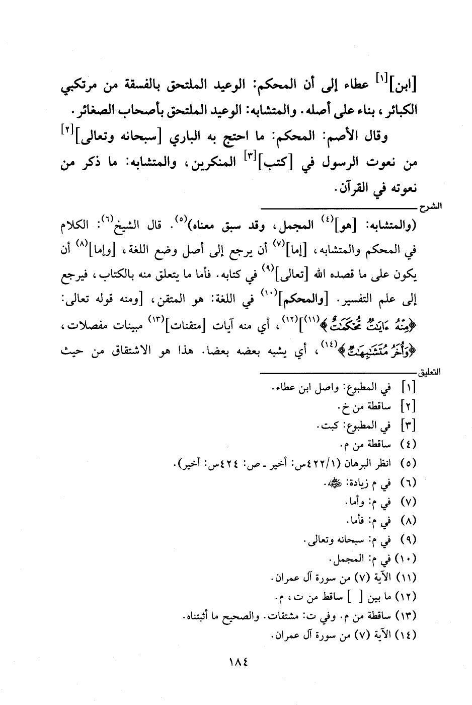 (والمتشابه: [هو] المجمل، وقد سبق معناه). قال الشيخ: الكلام في المحكم والمتشابه، [إما] أن يرجع إلى أصل وضع اللغة، [وإما] أن يكون على ما قصده الله [تعالى] في كتابه. فأما ما يتعلق منه بالكتاب، فيرجع إلى علم التفسير. [والمحكم] في اللغة: هو المتقن، [ومنه قوله تعالى: {منه ءايات محكمات}]، أي منه آيات [متقنات] مبينات مفصلات، } وأخر متشابهات}، أي يشبه بعضه بعضا. هذا هو الاشتقاق من حيث