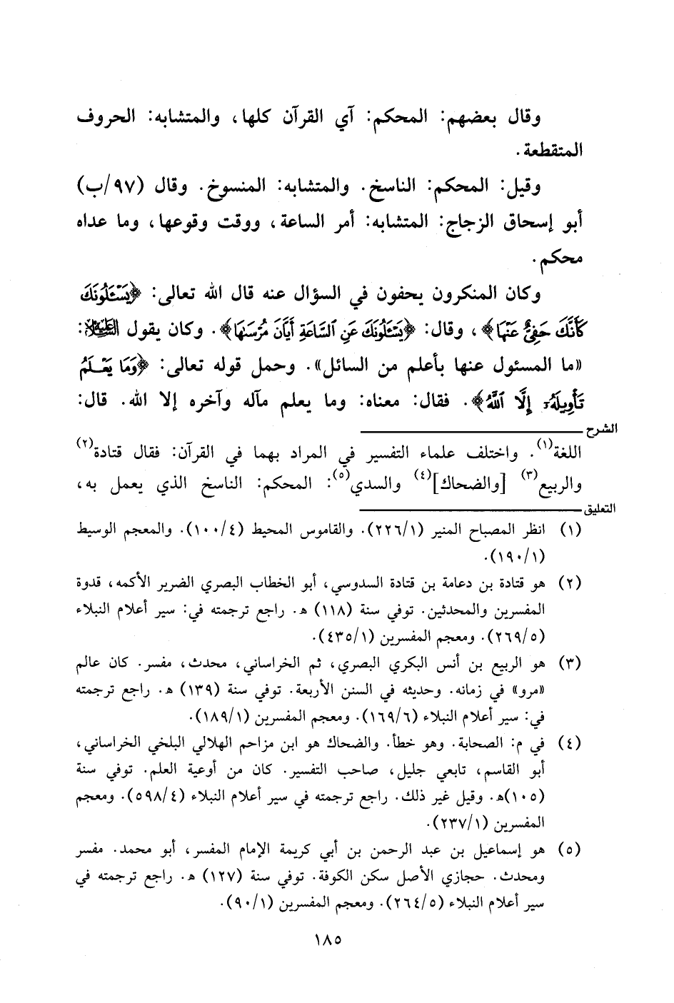 اللغة. واختلف علماء التفسير في المراد بهما في القرآن: فقال قتادة والربيع [والضحاك] والسدي: المحكم: الناسخ الذي يعمل به،