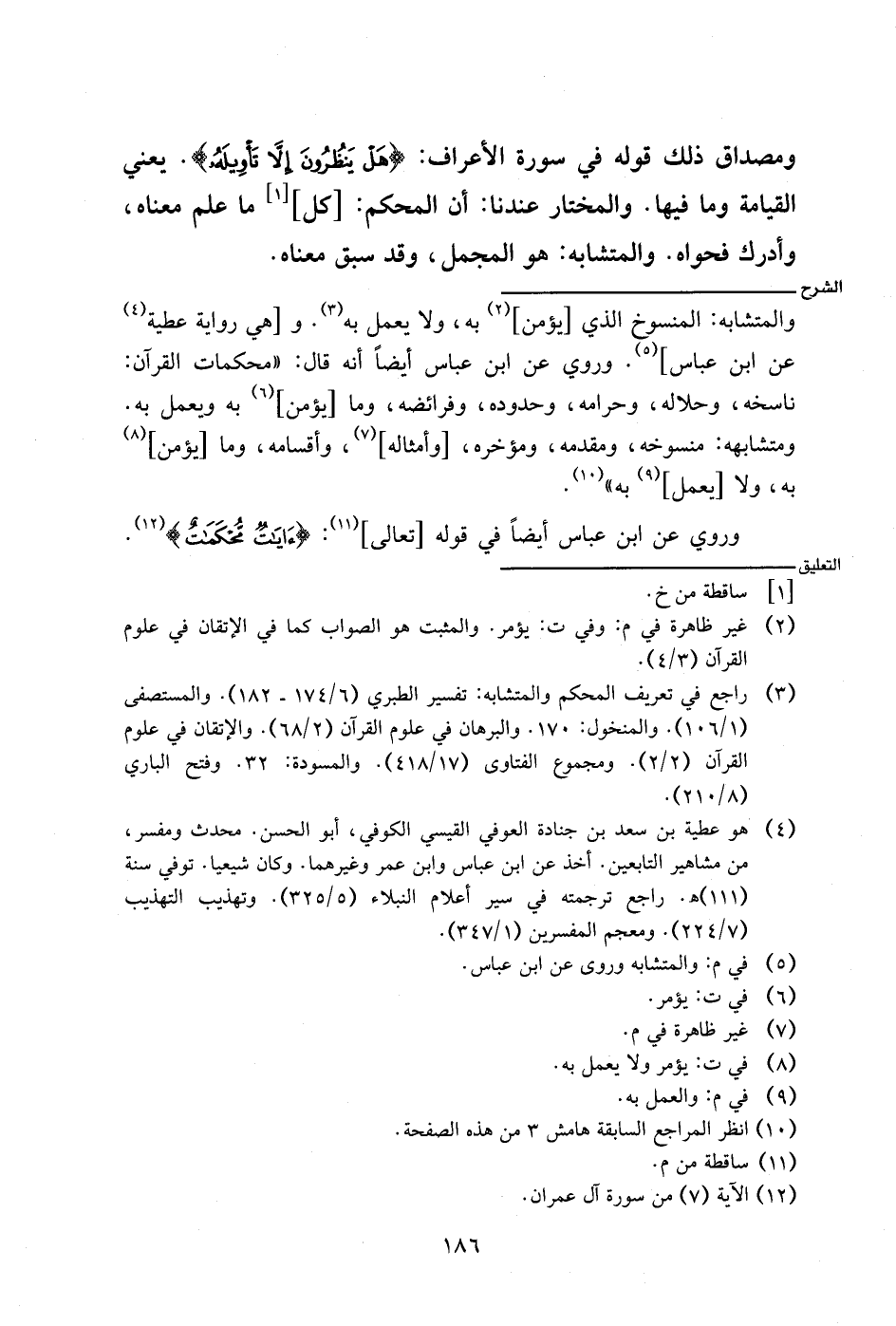 والمتشابه: المنسوخ الذي [يؤمن] به، ولا يعمل به. و [هي رواية عطية عن ابن عباس]. وروي عن ابن عباس أيضًا أنه قال: (محكمات القرآن: ناسخه، وحلاله، وحرامه، وحدوده، وفرائضه، وما [يؤمن] به ويعمل به. ومتشابهه: منسوخه، ومقدمه، ومؤخره، [وأمثاله]، وأقسامه، وما [يؤمن] به، ولا [يعمل] به).