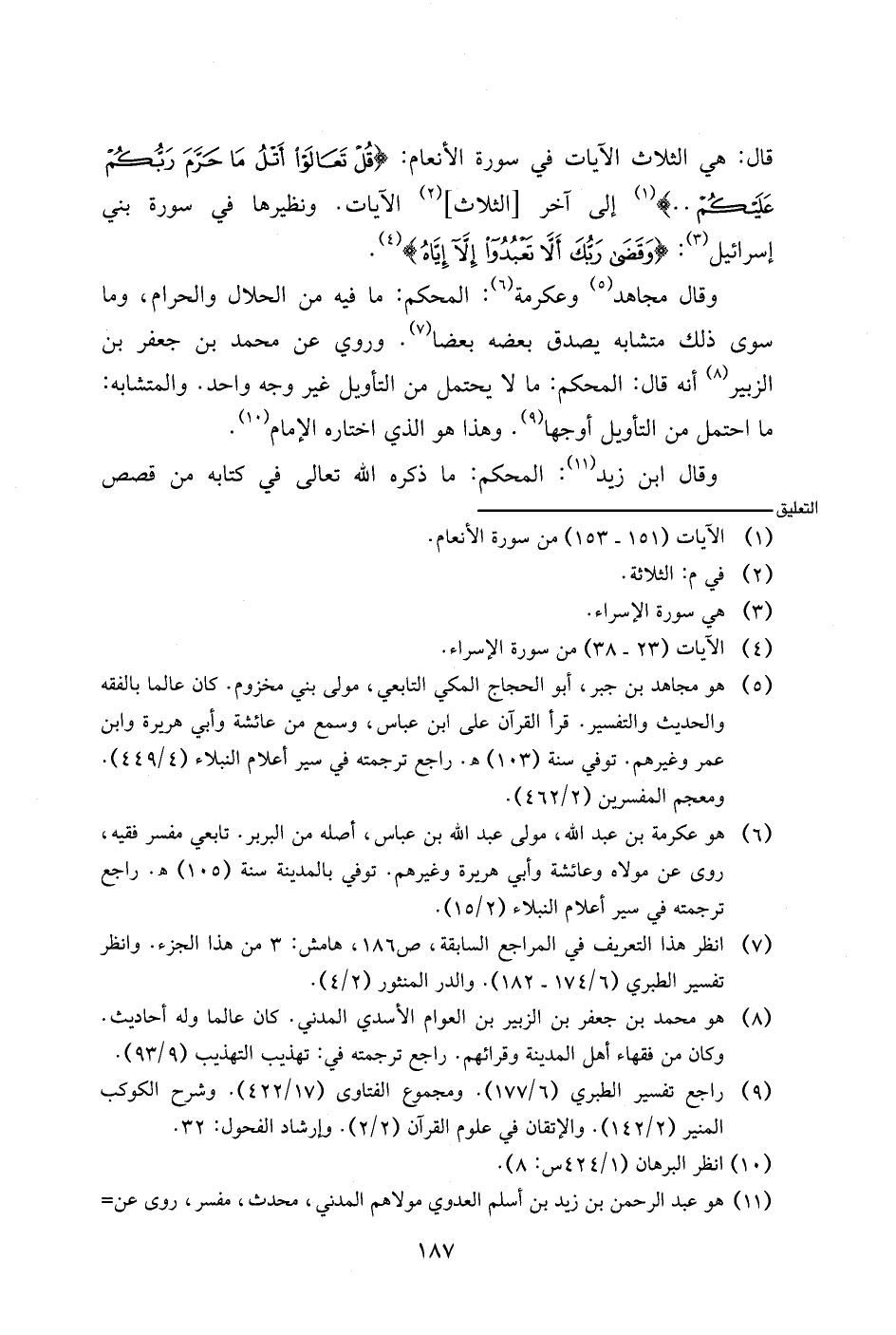 وقال مجاهد وعكرمة: المحكم: ما فيه من الحلال والحرام، وما سوى ذلك متشابه يصدق بعضه بعضا. وروي عن محمد بن جعفر بن الزبير أنه قال: المحكم: ما لا يحتمل من التأويل غير وجه واحد. والمتشابه: ما احتمل من التأويل أوجها. وهذا هو الذي اختاره الإمام.