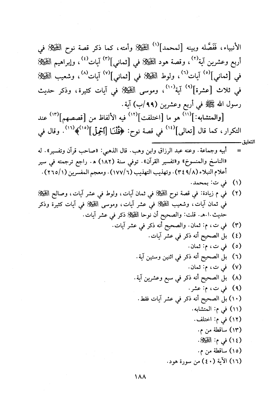 الأنبياء، ففصله وبينه [لمحمد]- عليه السلام - وأمته، كما ذكر قصة نوح - عليه السلام - في أربع وعشرين آية، وقصة هود - عليه السلام - في [ثماني] آيات، وإبراهيم - عليه السلام - في [ثماني] آيات، ولوط - عليه السلام - في [ثماني] آيات، وشعيب - عليه السلام - في ثلاث [عشرة] آية، وموسى - عليه السلام - في آيات كثيرة، وذكر حديث رسول الله صلى الله عليه وسلم في أربع وعشرين (٩٩/ب) آية.