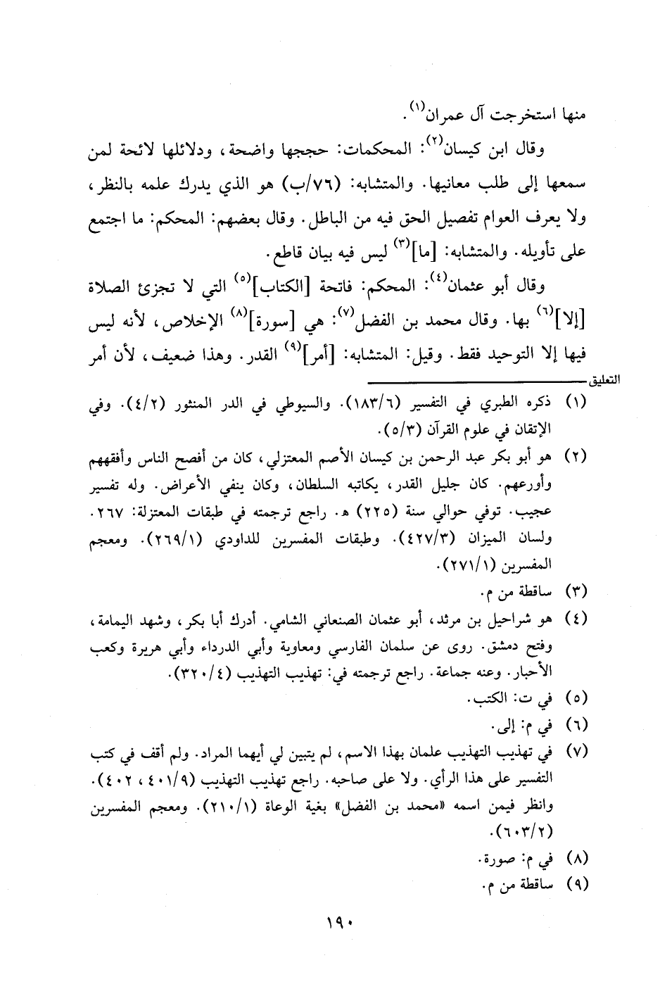وقال أبو عثمان: المحكم: فاتحة [الكتاب] التي لا تجزئ الصلاة [إلا] بها. وقال محمد بن الفضل: هي [سورة] الإخلاص، لأنه ليس فيها إلا التوحيد فقط. وقيل: المتشابه: [أمر] القدر. وهذا ضعيف، لأن أمر