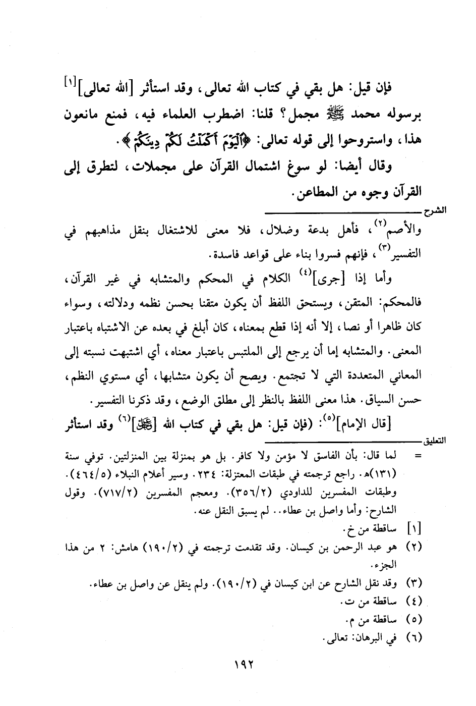 وأما إذا [جرى] الكلام في المحكم والمتشابه في غير القرآن، فالمحكم: المتقن، ويستحق اللفظ أن يكون متقنا بحسن نظمه ودلالته، وسواء كان ظاهرًا أو نصًا، إلا أنه إذا قطع بمعناه، كان أبلغ في بعده عن الاشتباه باعتبار المعنى. والمتشابه إما أن يرجع إلى المتلبس باعتبار معناه، أي اشتبهت نسبته إلى المعاني المتعددة التي لا تجتمع. ويصح أن يكون متشابها، أي مستوي النظم، حسن السياق. هذا معنى الفظ بالنظر إلى مطلق الوضع، وقد ذكرنا التفسير.