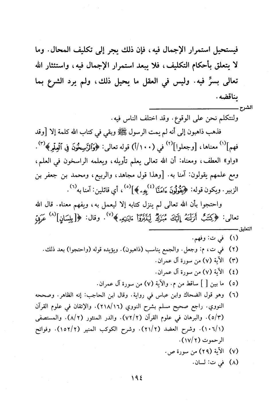 فذهب ذاهبون إلى أنه لم يمت الرسول صلى الله عليه وسلم وبقي في كتاب الله كلمة إلا [وقد فهم] معناها، [وجعلوا] في (١٠٠/أ) قوله تعالى: {والراسخون في العلم}. (واو) العطف، ومعناه: أن الله تعالى يعلم تأويله، ويعلمه الراسخون في العلم، ومع علمهم يقولون: آمنا به. [وهذا قول مجاهد، والربيع، محمد بن جعفر بن الزبير. ويكون قوله: {ويقولون ءامنا به}]، أي قائلين: آمنا به.