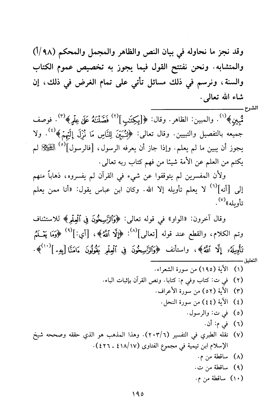 مبين}. والمبين: الظاهر. وقال: {[بكتب] فصلنه على علم}. فوصف جميعه بالتفصيل والتبيين. وقال تعالى: {لتبين للناس ما نزل إليهم}. ولا يجوز أن يبين ما لم يعلم. وإذا جاز أن يعرفه الرسول، [فالرسول]- عليه السلام - لم يكتم من العلم عن الأمة شيئا من فهم كتاب ربه تعالى.