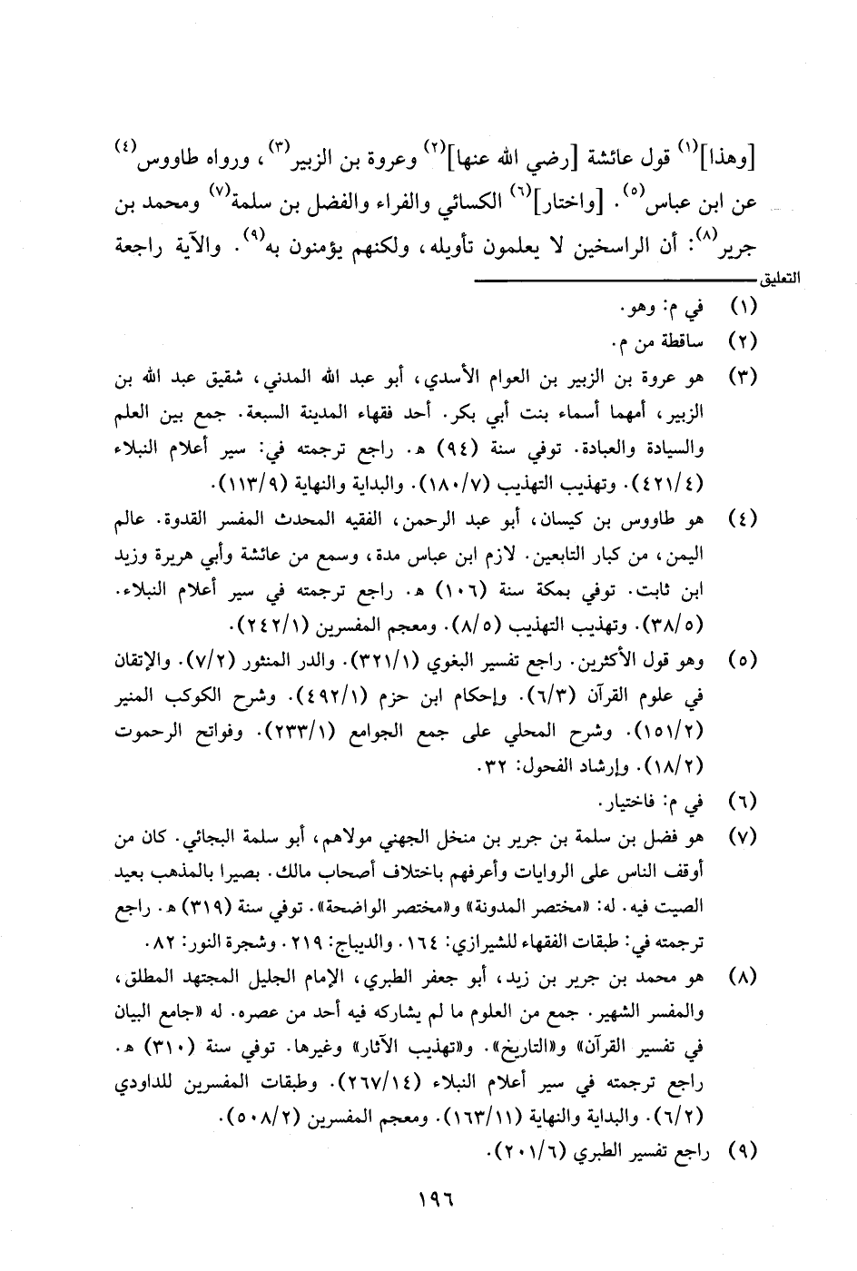 [وهذا] قول عائشة [رضي الله عنها] وعروة بن الزبير، ورواه طاووس عن ابن عباس. [واختار] الكسائي والفراء والفضل بن سلمة ومحمد بن جرير: أن الراسخين لا يعلمون تأويله، ولكنهم يؤمنون به. والآية راجعة