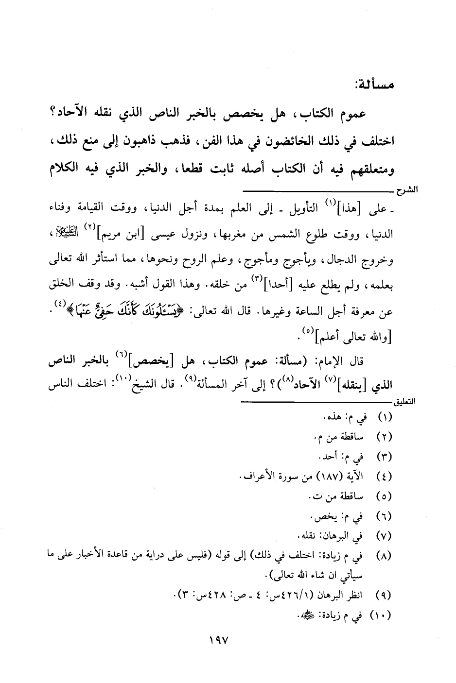 قال الإمام: (مسألة: عموم الكتاب، هل [يخصص] بالخبر الناص الذي [ينقله] الآحاد)؟ إلى آخر المسألة. قال الشيخ: اختلف الناس
