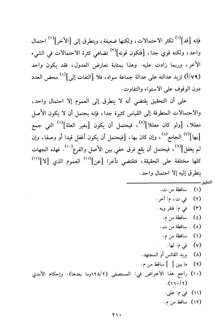 على أن التحقيق يقتضي أنه لا يتطرق إلى العموم إلا احتمال واحد، والاحتمالات المتطرقة إلى القياس كثيرة جدا، فإنه يحتمل أن لا يكون الأصل معللا، [ولو كان معللا]، فيحتمل أن يكون [بغير العلة] التي جمع [بها] الجامع، وإن كان بها، [فيحتمل أن يكون أغفل قيدا أو وصفا، وإن لم يغفل]، فيحتمل أن يقع فرق خفي بين الأصل والفرع. فهذه الجهات كلها مختلفة على الحقيقة، فتقتضي تأخرا [عن] العموم الذي [لا] يتطرق إليه إلا احتمال واحد.