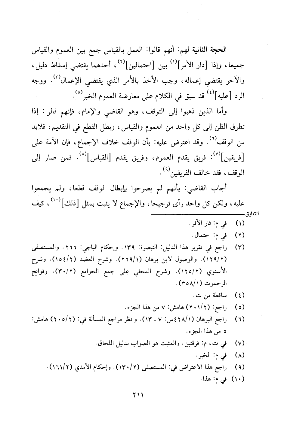 وأما الذين ذهبوا إلى التوقف، وهو القاضي والإمام، فإنهم قالوا: إذا تطرق الظن إلى كل واحد من العموم والقياس، وبطل القطع في التقديم، فلابد من الوقف. وقد اعترض عليه: بأن الوقف خلال الإجماع، فإن الأمة على [فريقين]: فريق يقدم العموم، وفريق يقدم [القياس]. فمن صار إلى الوقف، فقد خالف الفريقين.