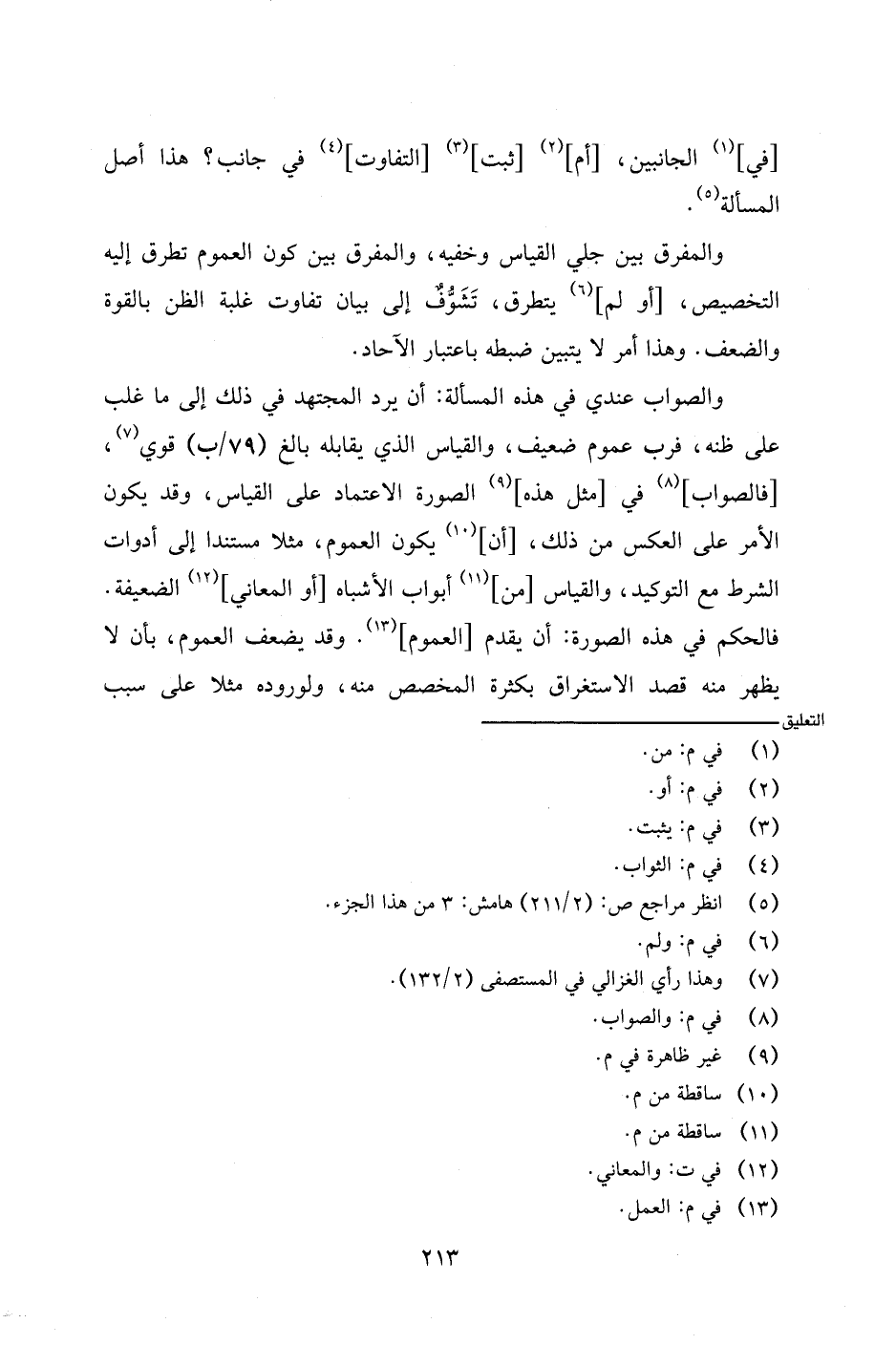 والصواب عندي في هذه المسألة: أن يرد المجتهد في ذلك إلى ما غلب على ظنه، فرب عموم ضعيف، والقياس الذي يقابله بالغ (٧٩/ب) قوي، [فالصواب] في [مثل هذه] الصورة الاعتماد على القياس، وقد يكون الأمر على العكس من ذلك، [أن] يكون العموم، مثلا مستندا إلى أدوات الشرط مع التوكيد، والقياس [من] أبواب الأشباه [أو المعاني] الضعيفة. فالحكم في هذه الصورة: أن يقدم [العموم]. وقد يضعف العموم، بأن لا يظهر منه قصد الاستغراق بكثرة المخصص منه، ولوروده مثلا على سبب