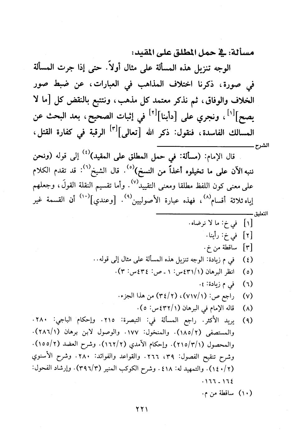 قال الإمام: (مسألة: في حمل المطلق على المقيد) إلى قوله (ونحن ننبه الآن على ما تخيلوه أخذًا من النسخ). قال الشيخ: قد تقدم الكلام على معنى كون اللفظ مطلقا ومعنى التقييد. وأما تقسيم النقلة القول، وجعلهم إياه ثلاثة أقسام، فهذه عبارة الأصوليين. [وعندي] أن القسمة غير