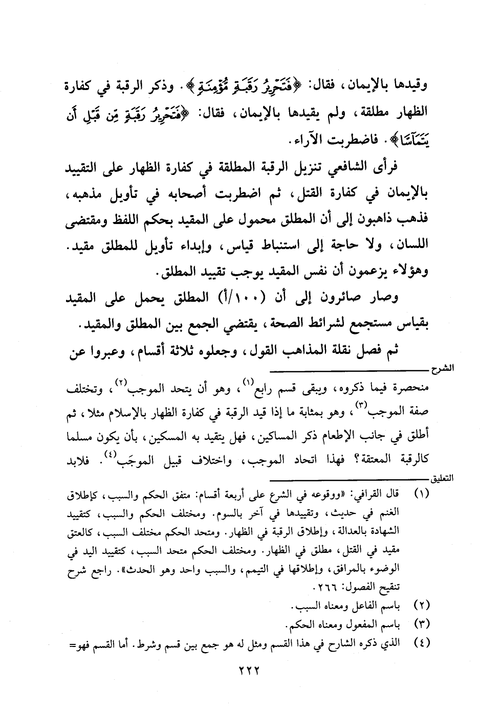 منحصرة فيما ذكروه، ويبقى قسم رابع، وهو أن يتحد الموجب، وتختلف صفة الموجب، وهو بمثابة ما إذا قيد الرقبة في كفارة الظهار بالإسلام مثلا، ثم أطلق في جانب الإطعام ذكر المساكين، فهل يتقيد به المسكين، بأن يكون مسلما كالرقبة المعتقة؟ فهذا اتحاد الموجب، واختلاف قبيل الموجب. فلابد