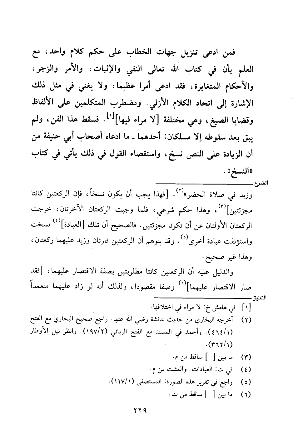 وزيد في صلاة الحضر). [فهذا يجب أن يكون نسخًا، فإن الركعتين كانتا مجزئتين]، وهذا حكم شرعي، فلما وجبت الركعتان الآخريان، خرجت الركعتان الأولتان عن أن تكونا مجزئتين. فالصحيح أن تلك [العبادة] نسخت واستؤنفت عبادة أخرى. وقد يتوهم أن الركعتين قارتان وزيد عليهما ركعتان، وهذا غي صحيح.