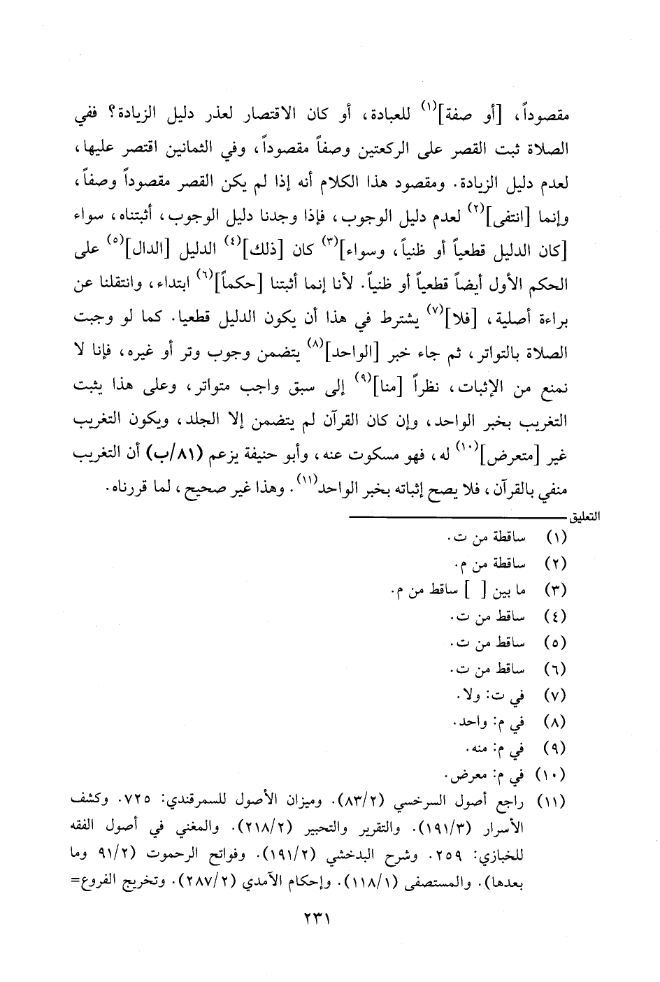 مقصودًا، [أو صفة] للعبادة، أو كان الاقتصار لعذر دليل الزيادة؟ ففي الصلاة ثبت القصر على الركعتين وصفًا مقصودًا، وفي الثمانين اقتصر عليها، لعدم دليل الزيادة. ومقصود هذا الكلام أنه إذا لم يكن القصر مقصودًا وصفًا، وإنما [انتفى] لعدم دليل الوجوب، فإذا وجدنا دليل الوجوب، أثبتناه، وسواء [كان الدليل قطعيًا أو ظنيًا، وسواء] كان [ذلك] الدليل [الدال] على الحكم الأول أيضًا قطعيًا أو ظنيًا. لأنا إنما أثبتنا [حكمًا] ابتداء، وانتقلنا عن براءة أصلية، [فلا] يشترط في هذا أن يكون الدليل قطعيا. كما لو وجبت الصلاة بالتواتر، ثم جاء خبر [الواحد] يتضمن وجوب وتر أو غيره، فإنا لا نمنع من الإثبات، نظرًا [منا] إلى سبق واجب متواتر، وعلى هذا يثبت التغريب بخبر الواحد، ون كان القرآن لم يتضمن إلا الجلد، ويكون التغريب غير [متعرض] له، فهو مسكوت عنه، وأبو حنيفة يزعم (٨١/ب) أن التغريب منفي بالقرآن، فلا يصح إثباته بخبر الواحد. وهذا غير صحيح، لما قررناه.