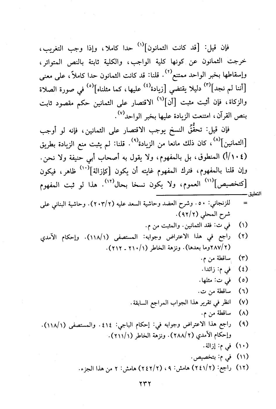 فإن قيل: تحقق النسخ يوجب الاقتصار على الثمانين، فإنه لو أوجب [الثمانين]، كان ذلك مانعا من الزيادة. قلنا: لم يثبت منع الزيادة بطريق (١٠٤/أ) المنطوق، بل بالمفهوم، ولا يقول به أصحاب أبي حنيفة ولا نحن. وإن قلنا بالمفهوم، فترك المفهوم غايته أن يكون [كإزالة] ظاهر، فيكون [كتخصيص] العموم، ولا يكون نسخا بحال. هذا لو ثبت المفهوم.