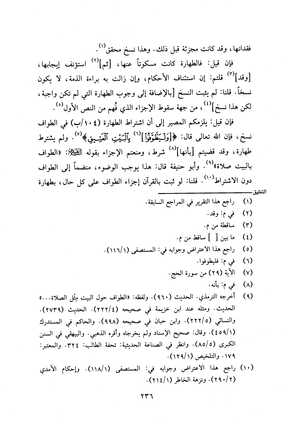 فإن قيل: يلزمكم المصير إلى أن اشتراط الطهارة (١٠٤/ب) في الطواف نسخ، فإن الله تعالى قال: {[وليطوفوا] بالبيت العتيق}. ولم يشترط طهارة، وقد قضيتم [بأنها] شرط، ومنعتم الأجزاء بقوله - عليه السلام -: (الطواف بالبيت صلاة). وأبو حنيفة قال: هذا يوجب الوضوء، منضمًا إلى الطواف دون الاشتراط. قلنا: لو ثبت بالقرآن أجزاء الطواف على كل حال، بطهارة