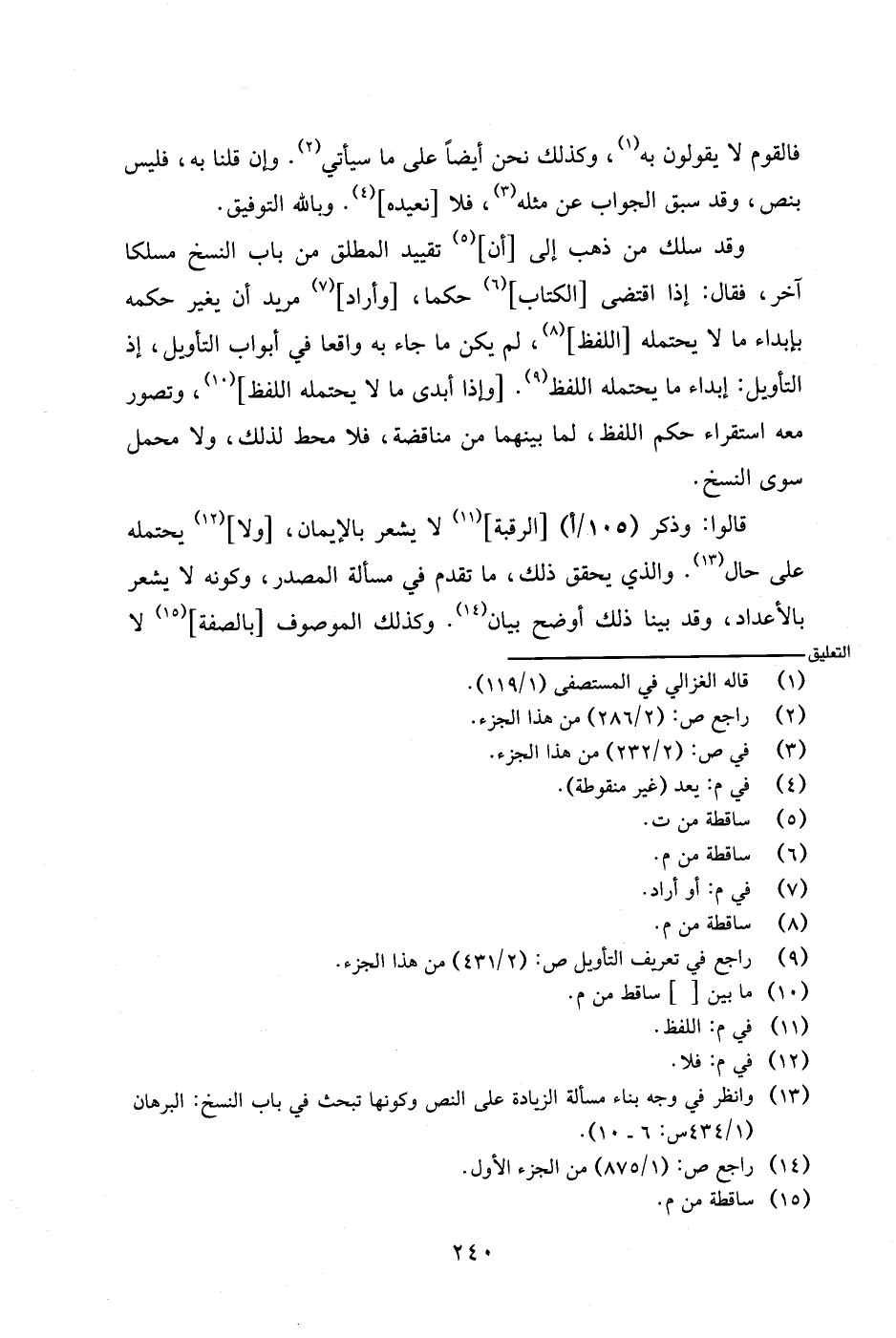 وقد سلك من ذهب إلى [أن] تقييد المطلق من باب النسخ مسلكا آخر، فقال: إذا اقتضى [الكتاب] حكما، [وأورد] مريد أن يغير حكمه بإبداء ما لا يحتمله [اللفظ]، لم يكن ما جاء به واقعا في أواب التأويل، إذ التأويل: إبداء ما يحتمله اللفظ. [وإذا أبدى ما لا يحتمله اللفظ]، وتصور معه استقراء حكم اللفظ، لما بينهما من مناقضة، فلا محط لذلك، ولا محمل سوى النسخ.