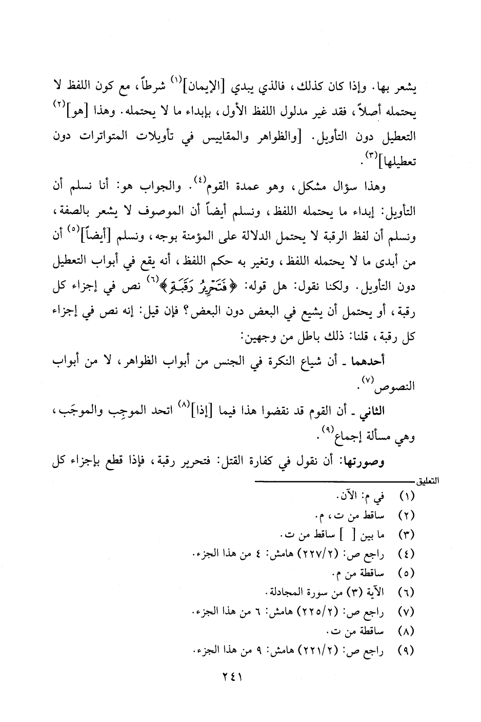وهذا سؤال مشكل، وهو عمدة القوم. والجواب هو: أنا نسلم أن التأويل: إبداء ما يحتمله اللفظ، ونسلم أيضًا أن الموصوف لا يشعر بالصفة، ونسلم أن لفظ الرقبة لا يحتمل الدلالة على المؤمنة بوجه، ونسلم [أيضًا] أن من أبدى ما لا يحتمله اللفظ، وتغير به حكم اللفظ، أنه يقع في أبواب التعطيل جون التأويل. ولكنا نقول: هل قوله: {فتحرير رقبة] نص في أجزاء كل رقبة، أو يحتمل أن يشيع في البعض دون البعض؟ فإن قيل: إنه نص في أجزاء كل رقبة، قلنا: ذلك باطل من وجهين: