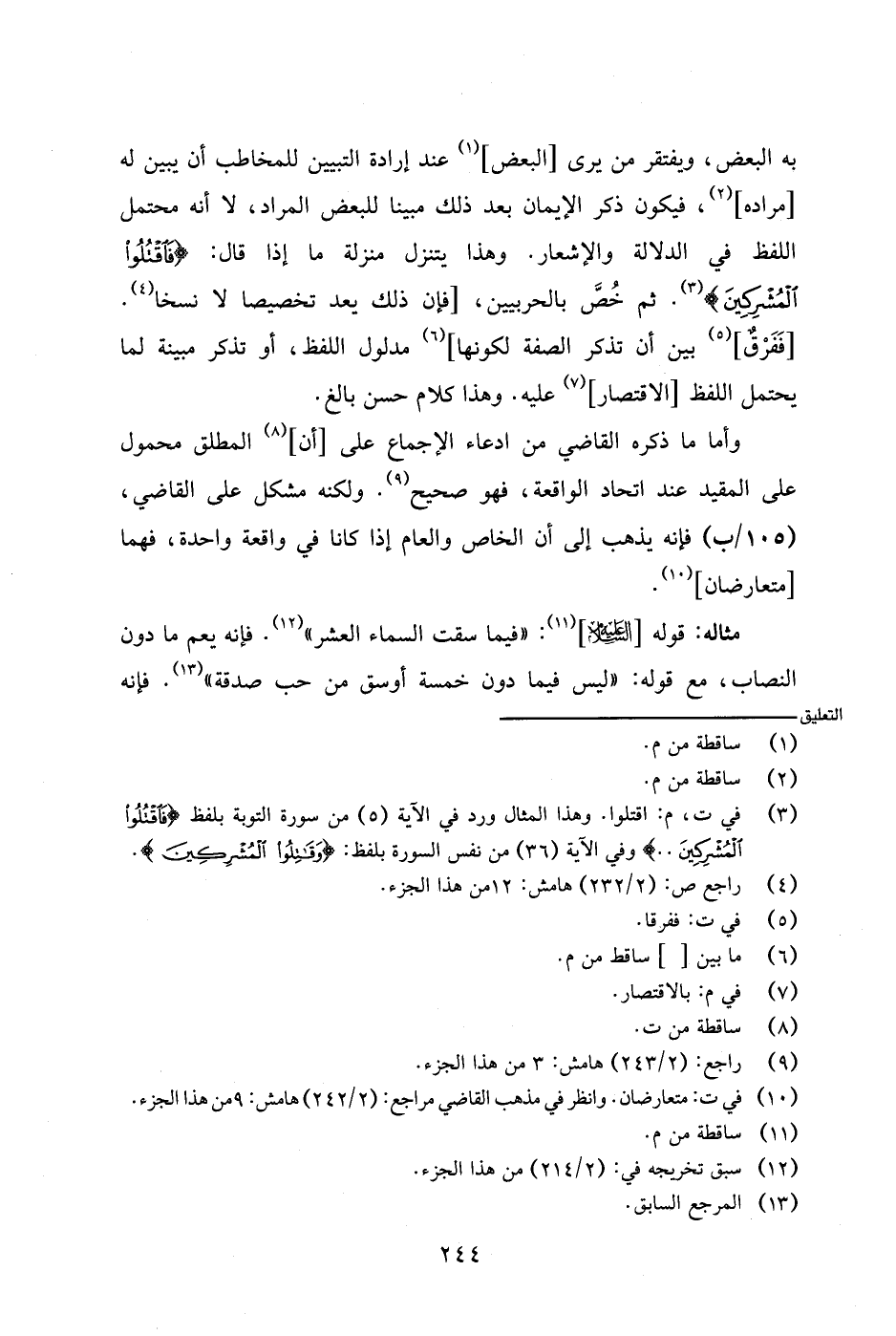 به البعض، ويفتقر من يرى [البعض] عند إرادة التبيين للمخاطب أن يبين له [مراده]، فيكون ذكر الإيمان بعد ذلك مبينا للبعض المراد، لا أنه محتمل اللفظ في الدلالة والإشعار. وهذا يتنزل منزلة ما إذا قال: {فاقتلوا المشركين}. ثم خص بالحربيين، [فإن ذلك يعد تخصيصا لا نسخا. [ففرق] بين أن تذكر الصفة لكونها] مدلول اللفظ، أو تذكر مبينة لما يحتمل اللفظ [الاقتصار] عليه. وهذا كلام حسن بالغ.