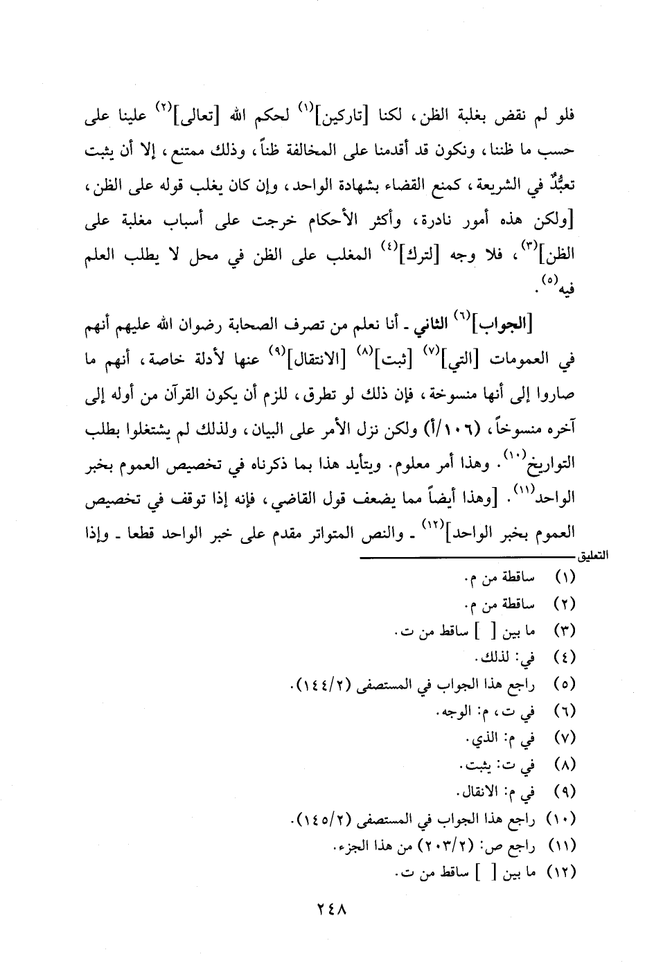 [الجواب] الثاني- أنا نعلم من تصرف الصحابة رضوان الله عليهم أنهم في العمومات [التي] [ثبت] [الانتقال] عنها لأدلة خاصة، أنهم ما صاروا على أنها منسوخة، فإن ذلك لو تطرق، للزم أن يكون القرآن من أوله إلى آخره منسوخًا، (١٠٦/أ) ولكن نزل الأمر على البيان، ولذلك لم يشتغلوا بطلب التواريخ. وهذا أمر معلوم. ويتأيد هذا بما في تخصيص العموم بخبر الواحد. [وهذا أيضًا مما يضعف قول القاضي، فإنه إذا توقف في تخصيص العموم بخبر الواحد]- والنص المتواتر مقدم على خبر الواحد قطعا- وإذا