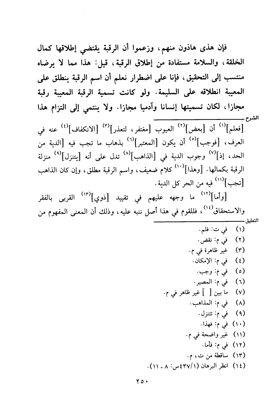 [فعلم] أن [بعض] العيوب [مغتفر، لتعذر] [الانكفاف] عنه في العرف، [فوجب] أن يكون [المعتبر] بذهاب ما تجب فيه [الدية من الحد، إذ] وجوب الدية في [الذاهب] تدل على أنه [يتنزل] منزلة الرقبة بكمالها. [وهذا] كلام ضعيف، واسم الرقبة مطلق، وإن كان الذاهب [تجب] فيه من الحر كل الدية.