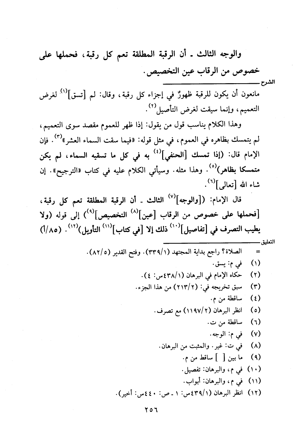 قال الإمام: ([والوجه] الثالث - أن الرقبة المطلقة تعم كل رقبة، [فحملها على خصوص من الرقاب [عين] التخصيص]) إلى قوله (ولا يطيب التصرف في [تفاصيل] ذلك إلا [في كتاب] التأويل). (٨٥/أ)