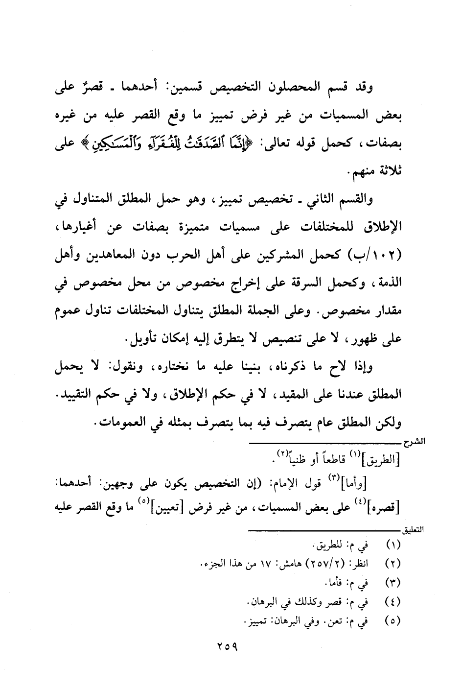 [وأما] قول الإمام: (إن التخصيص يكون على وجهين: أحدهما: [قصره] على بعض المسميات، من غير فرض [تعيين] ما وقع القصر عليه