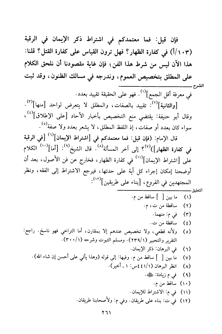 قال الإمام: (فإن قيل: فما معتمدكم في [اشتراط الإيمان] [في الرقبة في كفارة الظهار])؟ إلى آخر المسألة. قال الشيخ: [أما] الكلام على [اشتراط الإيمان] في كفارة الظهار، فخارج عن فن الأصول، بعد أن أوضحنا إمكان إجراء كل آية على حدتها، فيرجع الاشتراط إلى الفقه، ونظر المجتهدين في الفروع، [بناء على طريقين]: