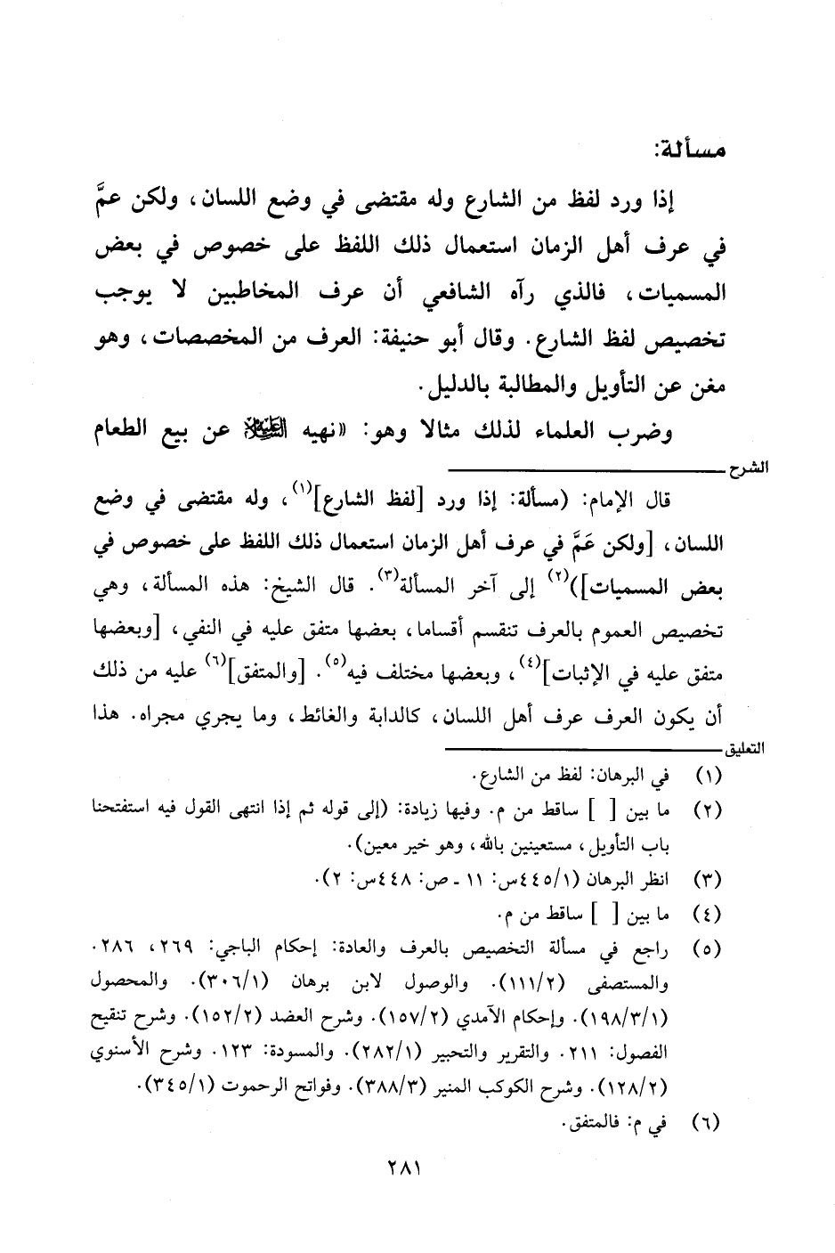 قال الإمام: (مسألة: إذا ورد [لفظ الشارع]، وله مقتضى في وضع اللسان، [ولكن عم في عرف أهل الزمان استعمال ذلك اللفظ على خصوص في بعض المسميات]) إلى آخر المسألة. قال الشيخ: هذه المسألة، وهي تخصيص العموم بالعرف تنقسم أقساما، بعضها متفق عليه في النفي، [وبعضها متفق عليه في الإثبات]، وبعضها مختلف فيه. [والمتفق] عليه من ذلك أن يكون العرف أهل اللسان، كالدابة والغائط، وما يجري مجراه. هذا