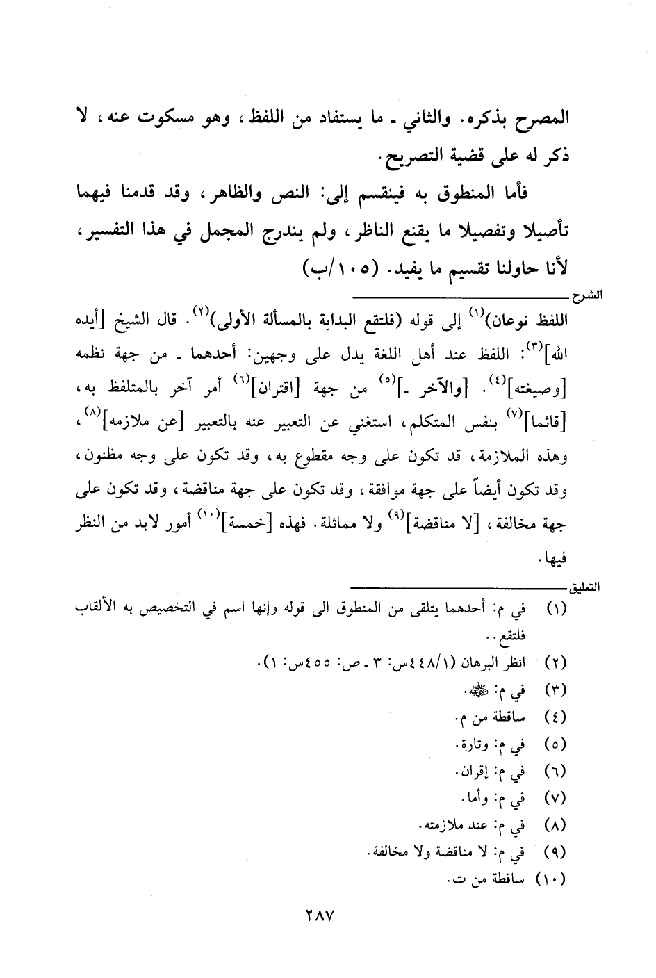 اللفظ نوعان) إلى قوله (فلتقع البداية بالمسألة الأولى). قال الشيخ [أيده الله]: اللفظ عند أهل اللغة يدل على وجهين: أحدهما- من جهة نظمه [وصيغته]. [والآخر-] من جهة [اقتران] أمر آخر بالمتلفظ به، [قائما] بنفس المتكلم، استغني عن التعبير عنه بالتعبير [عن ملازمه]، وهذه الملازمة، قد تكون على وجه مقطوع به، وقد تكون على وجه مظنون، وقد تكون أيضًا على جهة موافقة، وقد تكون على جهة مناقضة، وقد تكون على جهة مخالفة، [لا مناقضة] ولا مماثلة. فهذه [خمسة] أمور لابد من النظر فيها.