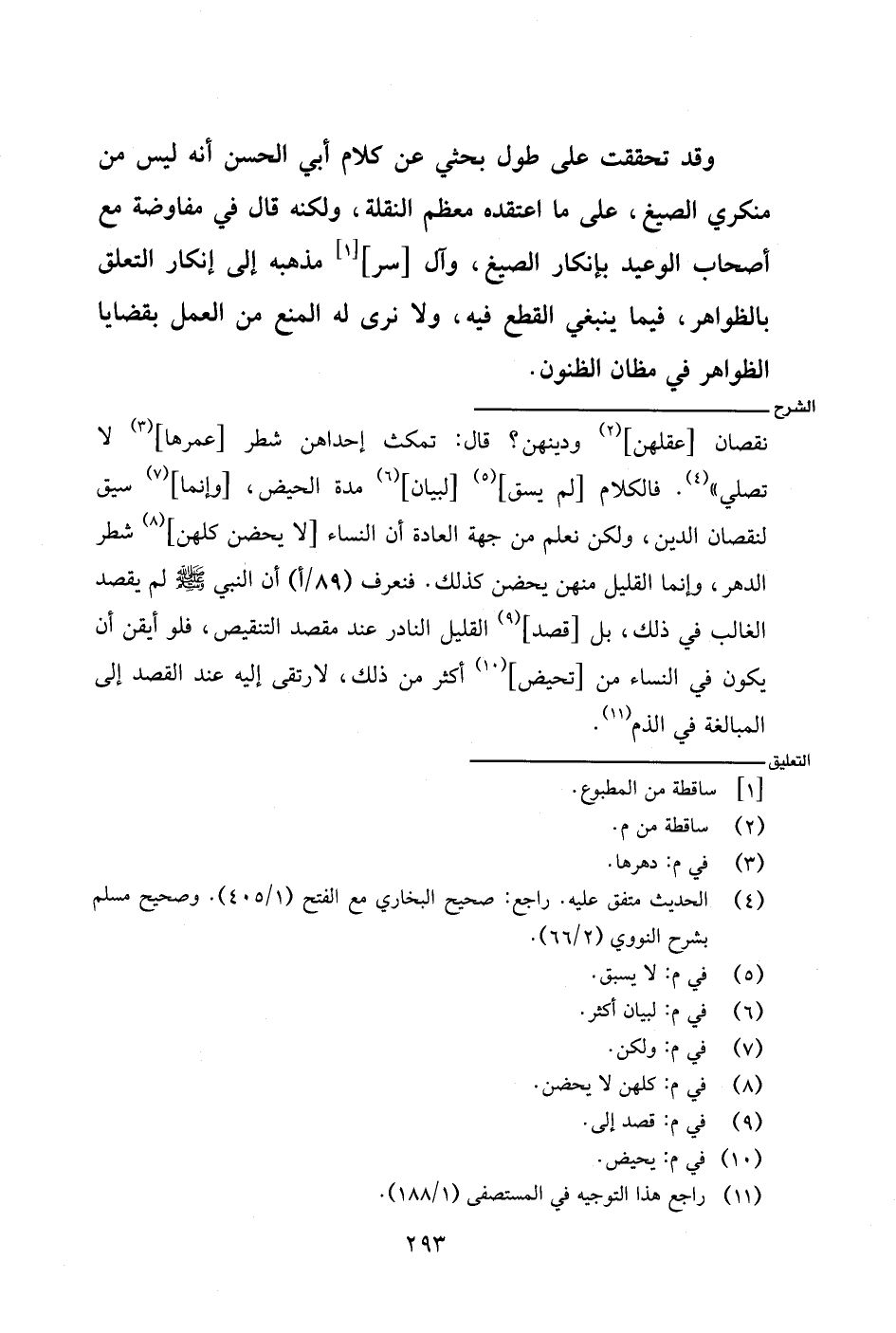 نقصان [عقلهن] ودينهن؟ قال: تمكث إحداهن شطر [عمرها] لا تصلي). فالكلام [لم يسق] [لبيان] مدة الحيض، [وإنما] سيق لنقصان الدين، ولكن نعلم من جهة العادة أن النساء [لا يحضن كلهن] شطر الدهر، وإنما القليل منهن يحضن كذلك. فنعرف (٨٩/أ) أن النبي صلى الله عليه وسلم لم يقصد الغالب في ذلك، بل [قصد] القليل النادر عند مقصد التنقيص، فلو أيقن أن يكون في النساء من [تحيض] أكثر من ذلك، لارتقى إليه عند القصد إلى المبالغة في الذم.