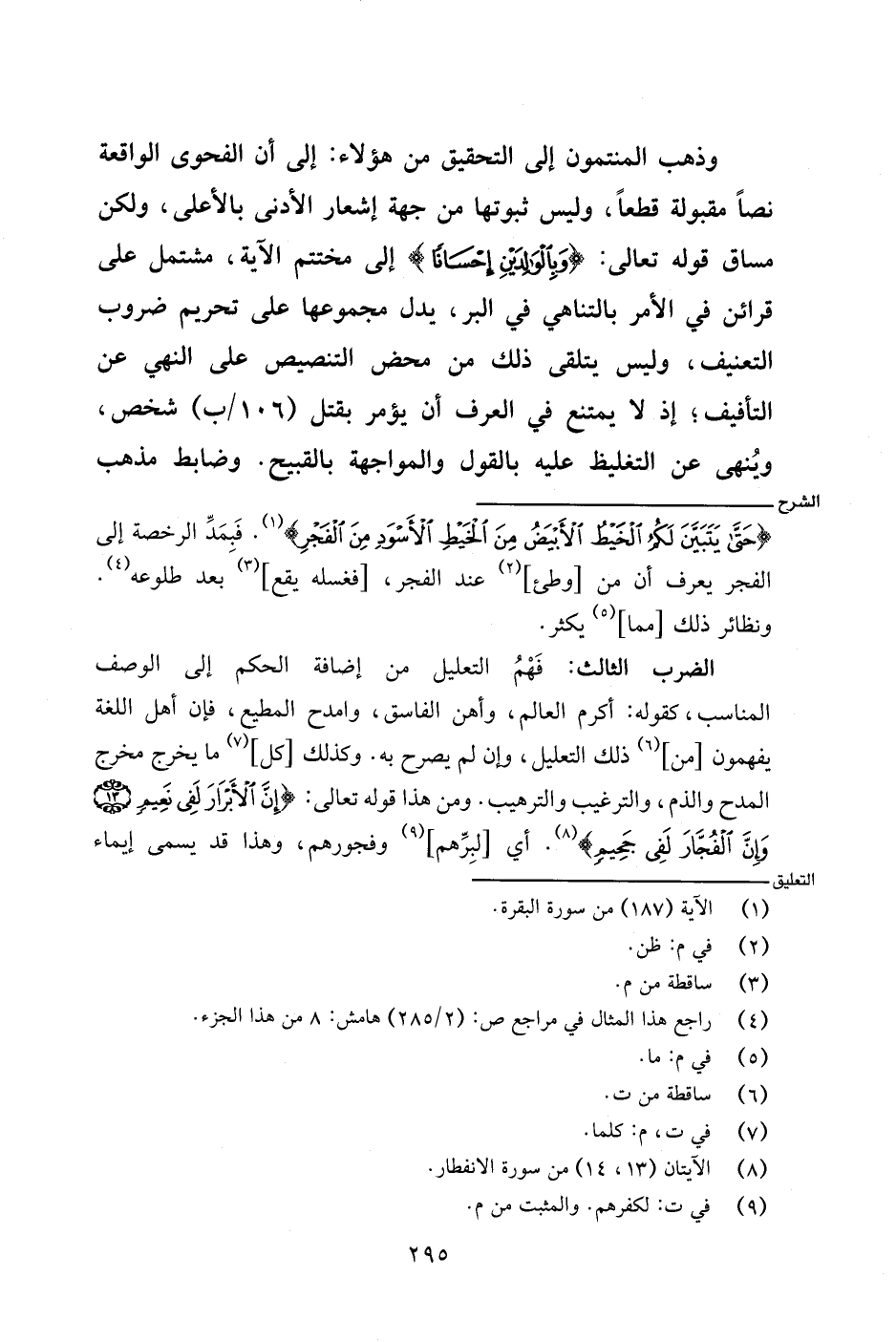 الضرب الثالث: فهم التعليل من إضافة الحكم إلى الوصف المناسب، كقوله: أكرم العالم، وأهن الفاسق، وامدح المطيع، فإن أهل اللغة يفهمون [من] ذلك التعليل، وإن لم يصرح به. وكذلك [كل] ما يخرج مخرج المدح والذم، والترغيب والترهيب. ومن هذا قوله تعالى: {إن الأبرار لفي نعيمٍ وإن الفجار لفي جحيم}. أي [لبرهم] وفجورهم، وهذا قد يسمى إيماء