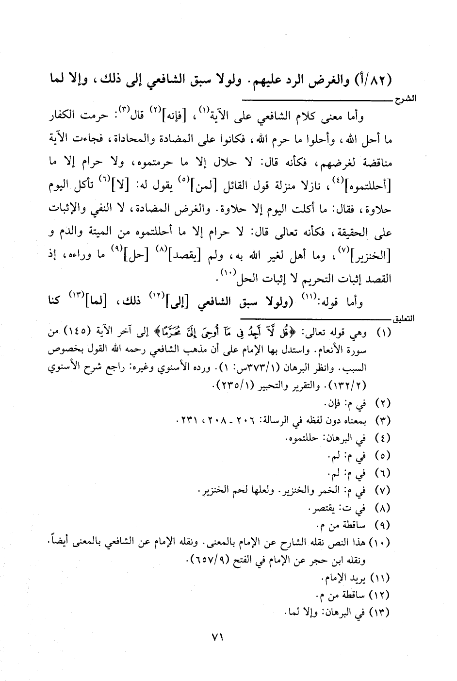 وأما معنى كلام الشافعي على الآية، [فإنه] قال: حرمت الكفار ما أحل الله، وأحلوا ما حرم الله، فكانوا على المضادة والمحاداة، فجات الآية مناقضة لغرضهم، فكأنه قال: لا حلال إلا ما حرمتموه، ولا حرام إلا ما [أحللتموه]، نازلا منزلة قول القائل [لمن] يقول له: [لا] تأكل اليوم حلاوة، فقال: ما أكلت اليوم إلا حلاوة. والغرض المضادة، لا النفي والإثبات على الحقيقة، فكأنه تعالى قال: لا حرام إلا ما أحللتموه من الميتة والدم و [الخنزير]، وما أهل لغير الله به، ولم [يقصد] [حل] ما وراءه، إذ القصد إثبات التحريم لا إثبات الحل.
