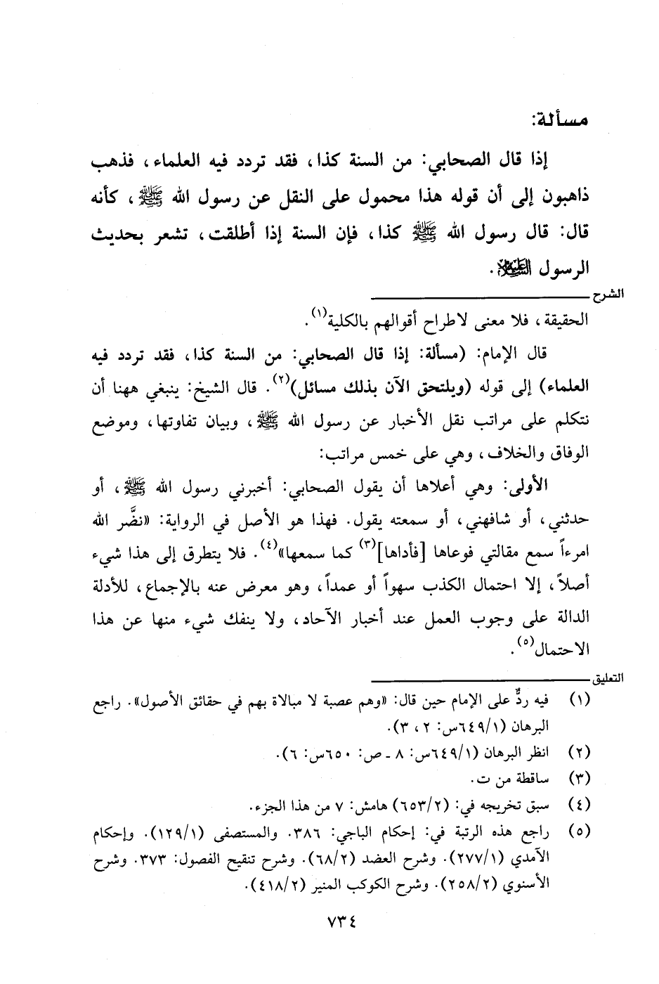 قال الإمام: (مسألة: إذا قال الصحابي: من السنة كذا، فقد تردد فيه العلماء) إلى قوله (ويلتحق الآن بذلك مسائل). قال الشيخ: ينبغي ههنا أن نتكلم على مراتب نقل الأخبار عن رسول الله - صلى الله عليه وسلم -، وبيان تفاوتها، وموضع الوفاق والخلاف، وهي على خمس مراتب: