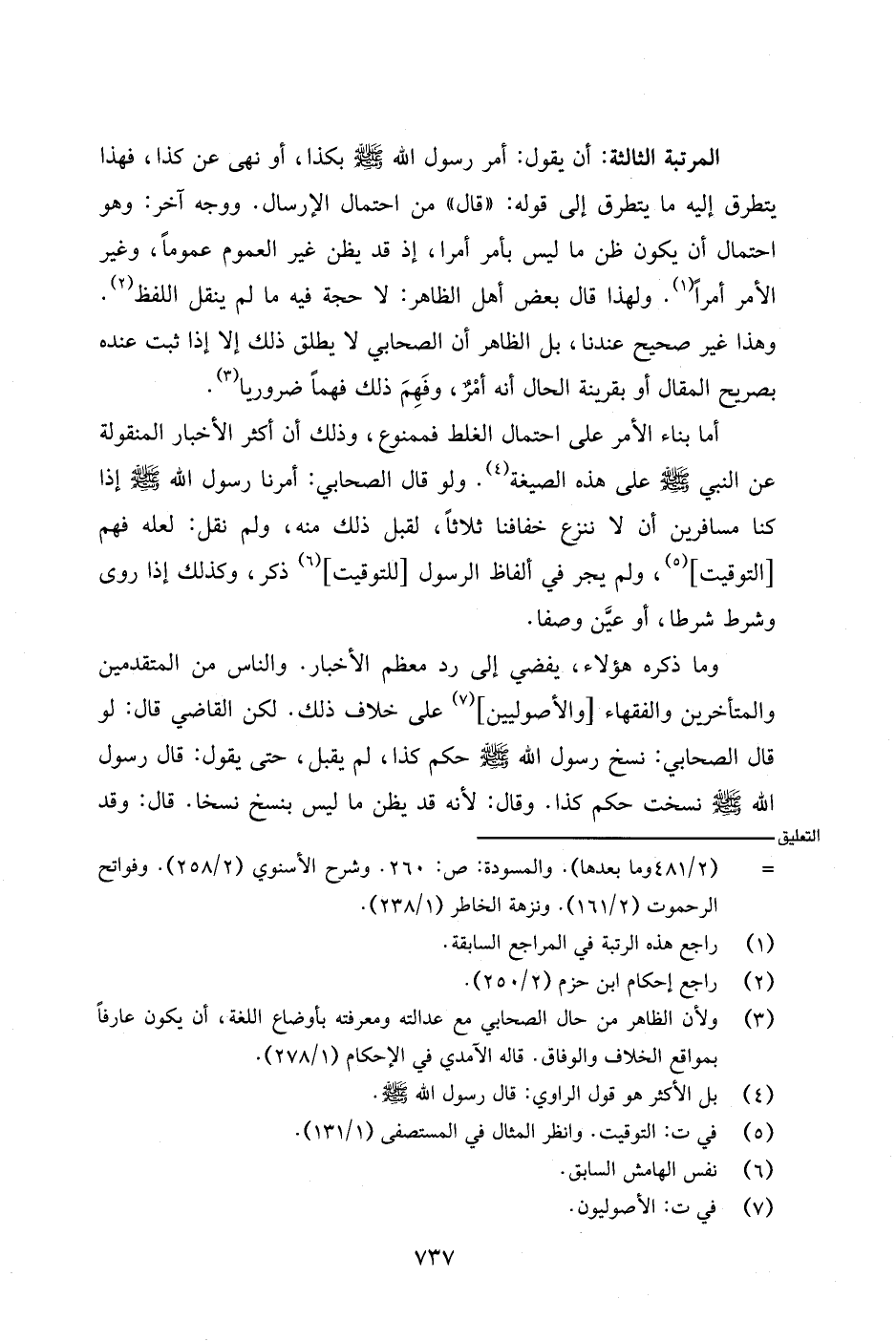 المرتبة الثالثة: أن يقول: أمر رسول الله - صلى الله عليه وسلم - بكذا، أو نهى عن كذا، فهذا يتطرق إليه ما يتطرق إلى قوله: (قال) من احتمال الإرسال. ووجه آخر: وهو احتمال أن يكون ظن ما ليس بأمر أمرا، إذ قد يظن غير العموم عمومًا، وغير الأمر أمرًا. ولهذا قال بعض أهل الظاهر: لا حجة فيه ما لم ينقل اللفظ. وهذا غير صحيح عندنا، بل الظاهر أن الصحابي لا يطلق ذلك إلا إذا ثبت عنده بصريح المقال أو بقرينة الحال أنه أمر، وفهم ذلك فهمًا ضروريًا.