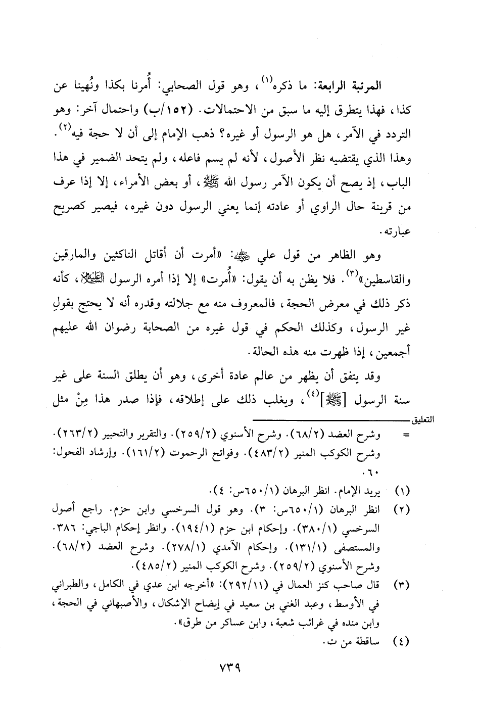 المرتبة الرابعة: ما ذكره، وهو قول الصحابي: أمرنا بكذا ونهينا عن كذا، فهذا يتطرق إليه ما سبق من الاحتمالات. (١٥٢/ب) واحتمال آخر: وهو التردد في الآمر، هل هو الرسول أو غيره؟ ذهب الإمام إلى أن لا حجة فيه. وهذا الذي يقتضيه نظر الأصول، لأنه لم يسم فاعله، ولم يتحد الضمير في هذا الباب، إذ يصح أن يكون الآمر رسول الله - صلى الله عليه وسلم -، أو بعض الأمراء، إلا إذا عرف من قرينة حال الراوي أو عادته إنما يعني الرسول دون غيره، فيصير كصريح عبارته.