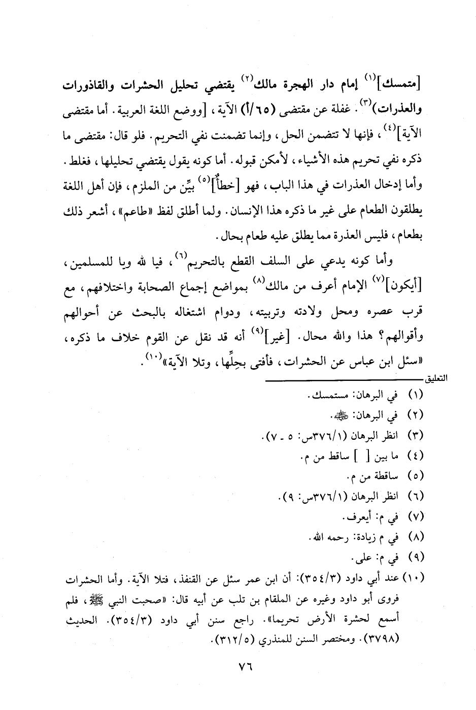 وأما كونه يدعي على السلف القطع بالتحريم، فيا لله ويا للمسلمين، [أيكون] الإمام أعرف من مالك بمواضع إجماع الصحابة واختلافهم، مع قرب عصره ومحل ولادته وتربيته، ودوام اشتغال بالبحث عن أحوالهم وأقوالهم؟ هذا والله محال. [غير] أنه قد نقل عن القوم خلاف ما ذكره، (سئل ابن عباس عن الحشرات، فأفتى بحلها، وتلا الآية).