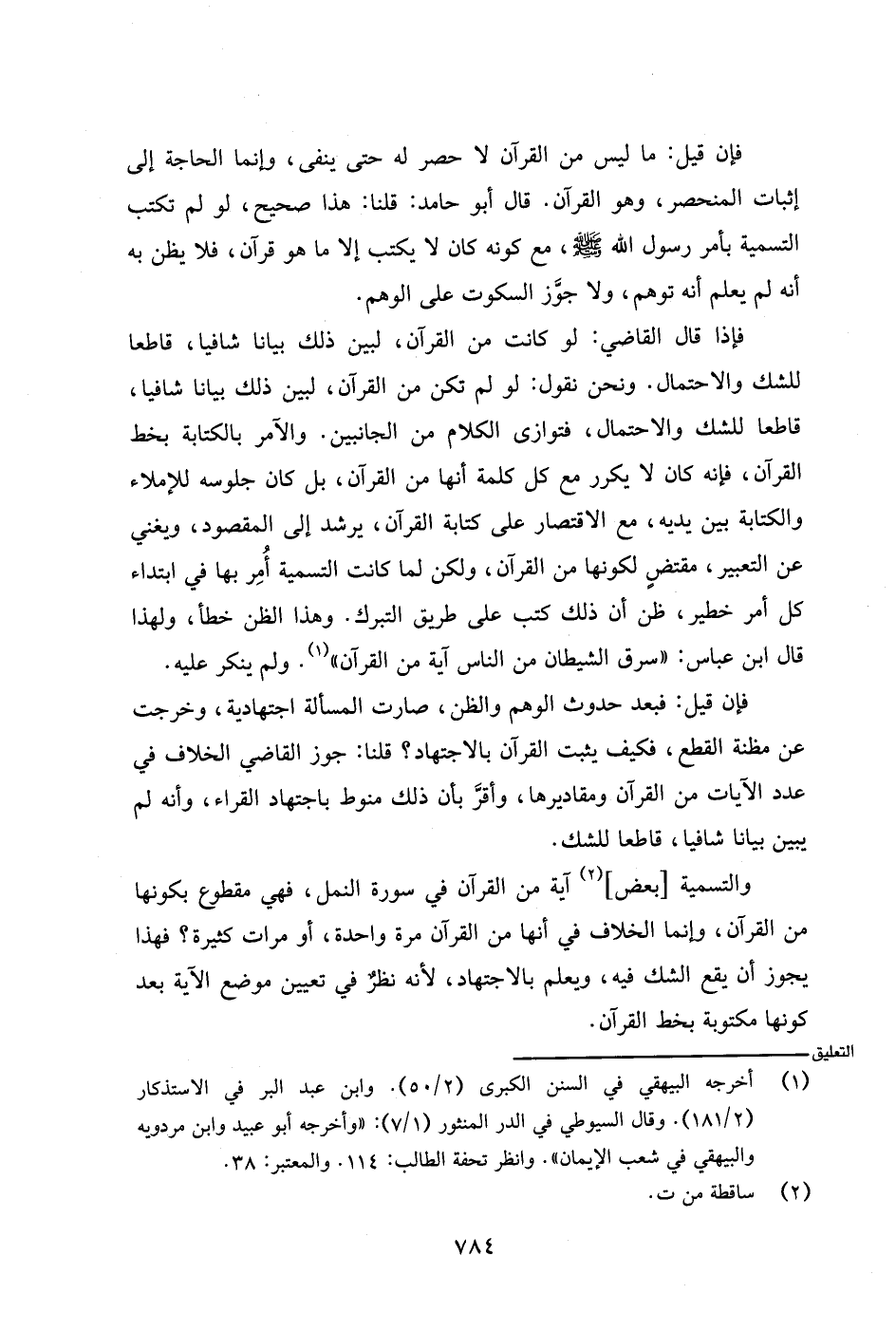 فإن قيل: ما ليس من القرآن لا حصر له حتى ينفى، وإنما الحاجة إلى إثبات المنحصر، وهو القرآن. قال أبو حامد: قلنا: هذا صحيح، لو لم تكتب التسمية بأمر رسول الله - صلى الله عليه وسلم -، مع كونه كان لا يكتب إلا ما هو قرآن، فلا يظن به أنه لم يعلم أنه توهم، ولا جوز السكوت على الوهم.