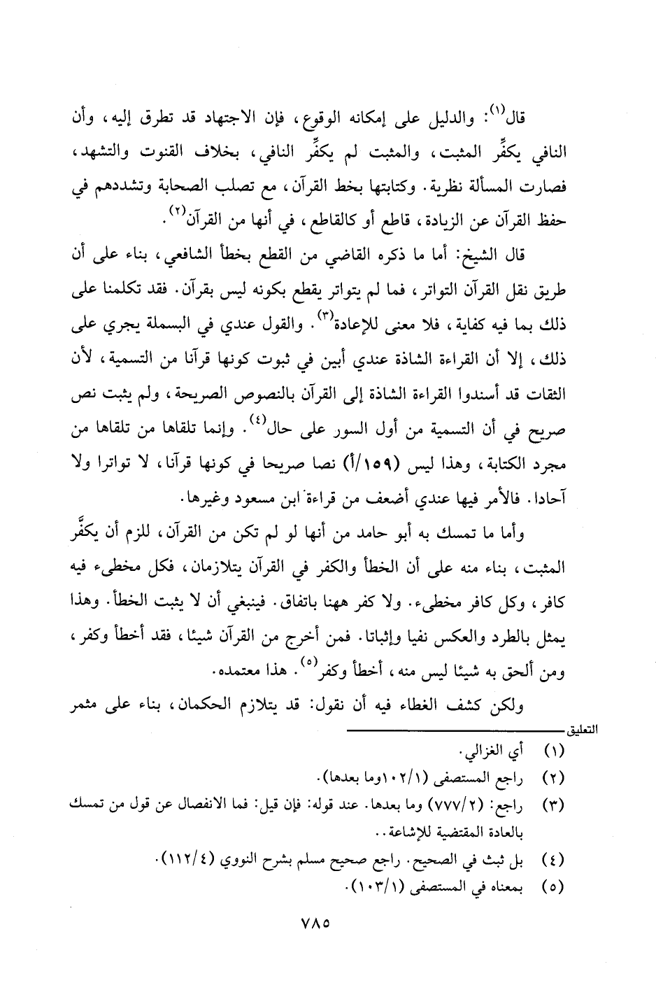 وأما ما تمسك به أبو حامد من أنها لو لم تكن من القرآن، للزم أن يكفر المثبت، بناء منه على أن الخطأ والكفر في القرآن يتلازمان، فكل مخطئ فيه كافر، وكل كافر مخطئ. ولا كفر ههنا باتفاق. فينبغي أن لا يثبت الخطأ. وهذا يمثل بالطرد والعكس نفيا وإثباتا. فمن أخرج من القرآن شيئا. فقد أخطأ وكفر، ومن ألحق به شيئا ليس منه، أخطأ وكفر. هذا معتمده.
