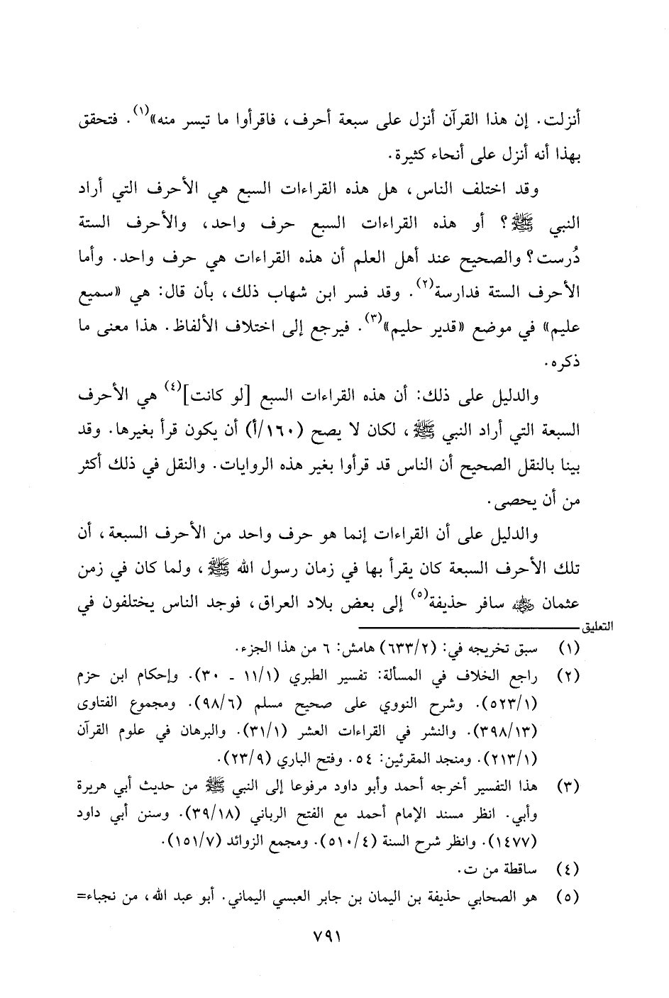 والدليل على أن القراءات إنما هو حرف واحد من الأحرف السبعة، أن تلك الأحرف السبعة كان يقرأ بها في زمان رسول الله - صلى الله عليه وسلم -، ولما كان في زمن عثمان - رضي الله عنه - سافر حذيفة إلى بعض بلاد العراق، فوجد الناس يختلفون في