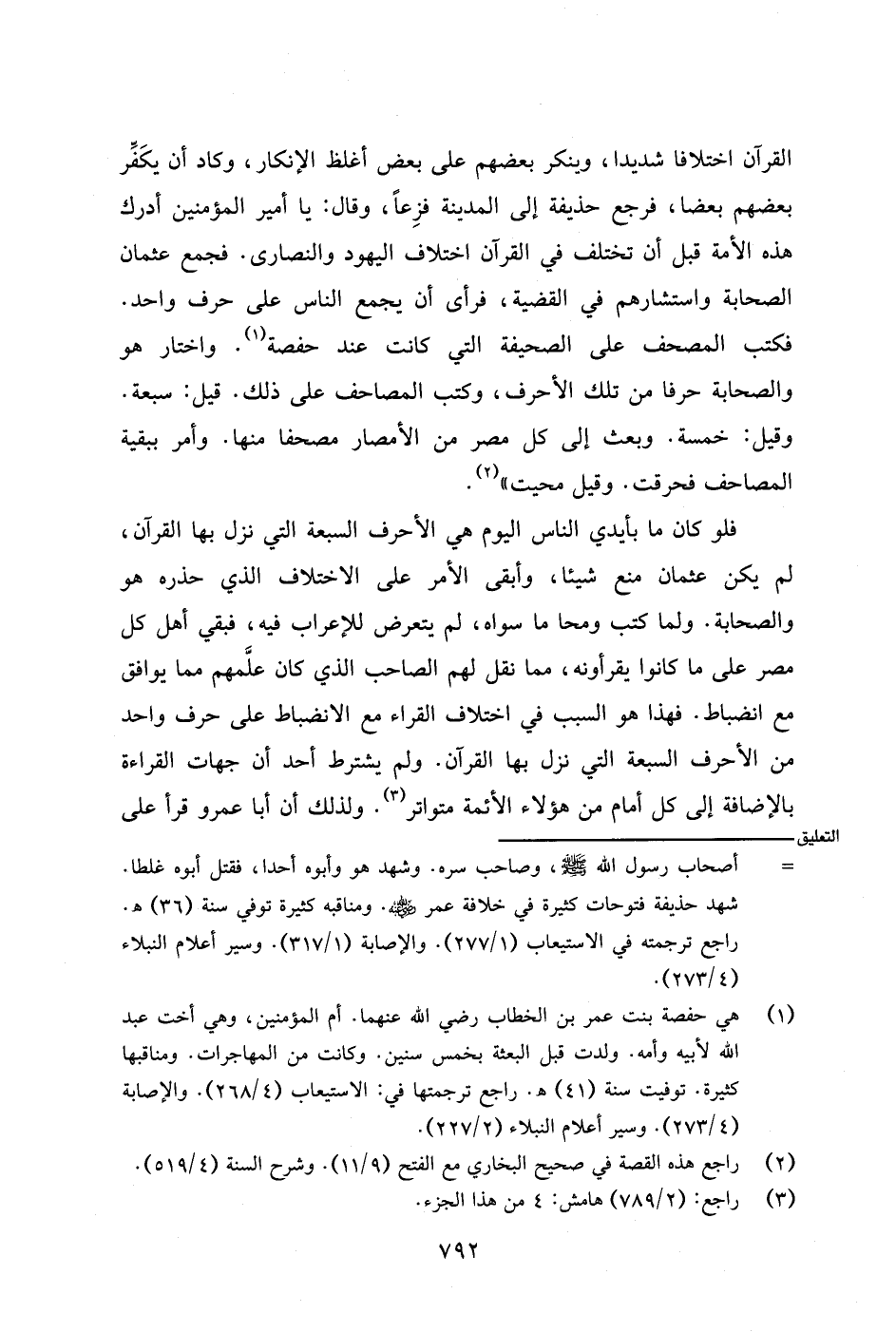 القرآن اختلافا شديدا، وينكر بعضهم على بعض أغلظ الإنكار، وكاد أن يكفر بعضهم بعضا، فرجع حذيفة إلى المدينة فزعًا، وقال: يا أمير المؤمنين أدرك هذه الأمة قبل أن تختلف في القرآن اختلاف اليهود والنصارى. فجمع عثمان الصحابة واستشارهم في القضية، فرأى أن يجمع الناس على حرف واحد. فكتب المصحف على الصحيفة التي كانت عند حفصة. واختار هو والصحابة حرفا من تلك الأحرف، وكتب المصاحف على ذلك. قيل: سبعة. وقيل: خمسة. وبعث إلى كل مصر من الأمصار مصحفا منها. وأمر ببقية المصاحف فحرقت. وقيل محيت).