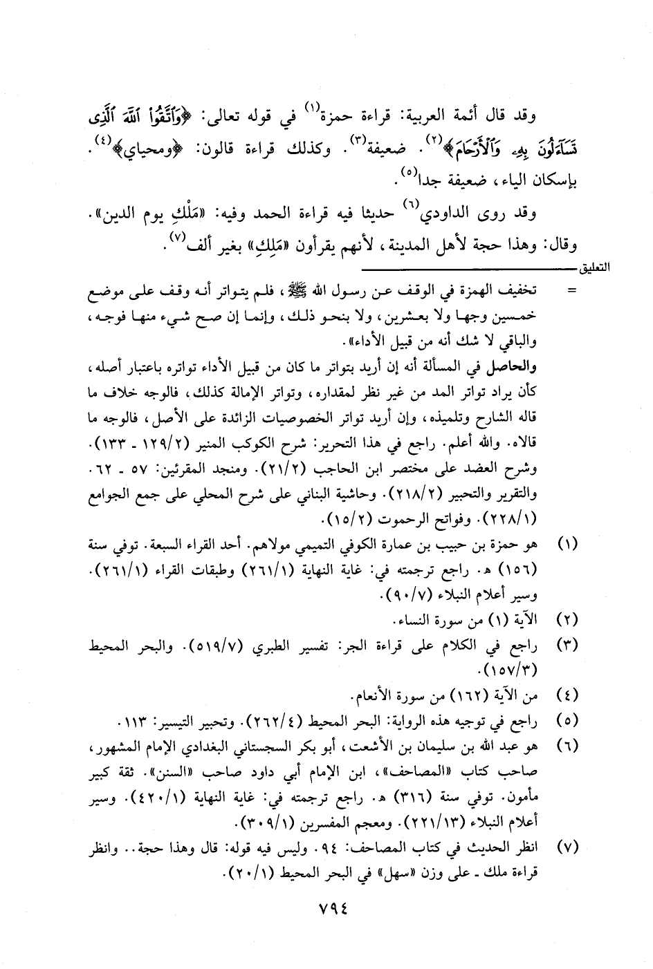 وقد قال أئمة العربية: قراءة حمزة في قوله تعالى: {واتقوا الله الذي تساءلون به والأرحام}. ضعيفة. وكذلك قراءة قالون: {ومحياي}. بإسكان الياء، ضعيفة جدا.