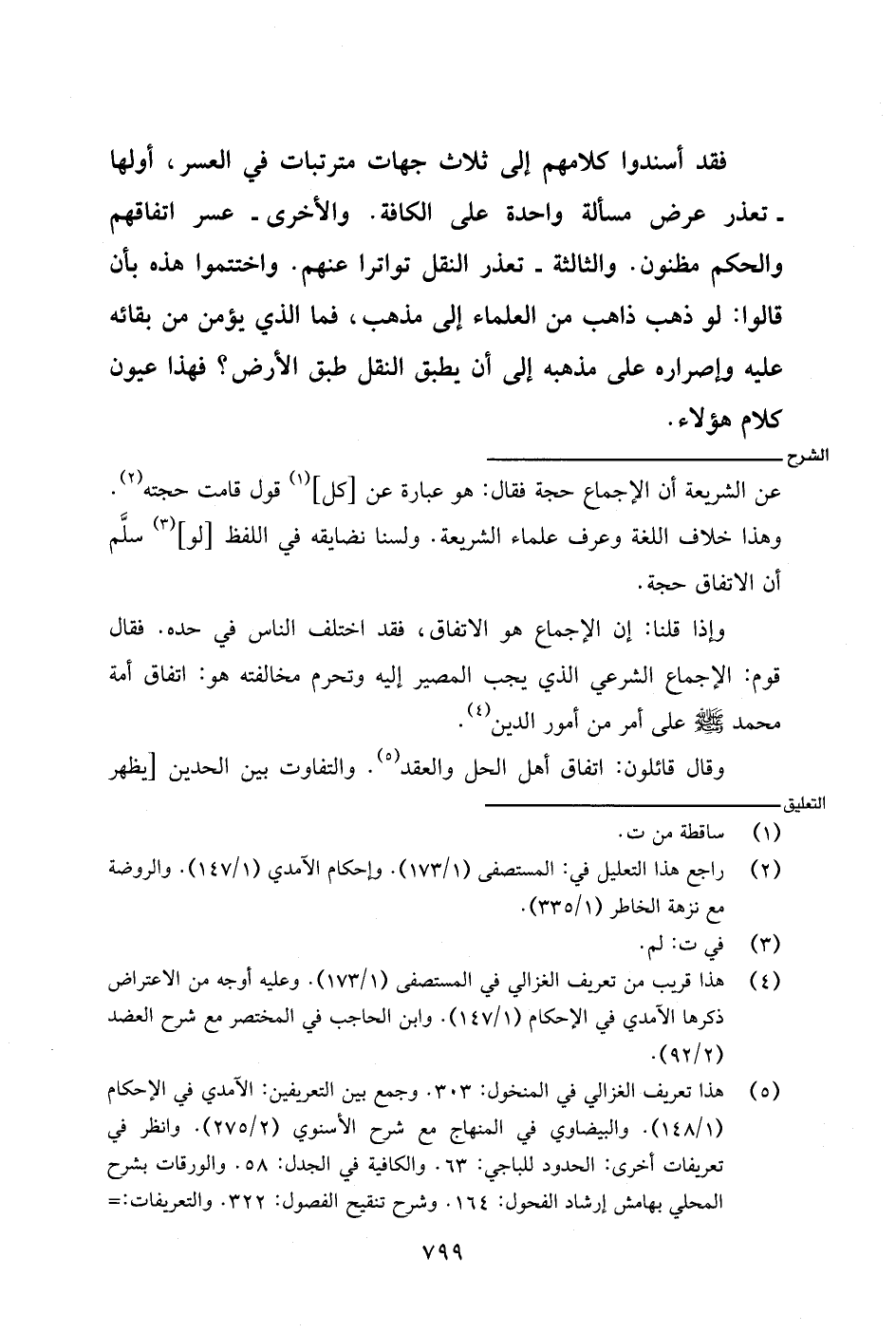 وإذا قلنا: إن الإجماع هو الاتفاق، فقد اختلف الناس في حده. فقال قوم: الإجماع الشرعي الذي يجب المصير إليه وتحرم مخالفته هو: اتفاق أمة محمد - صلى الله عليه وسلم - على أمر من أمور الدين.