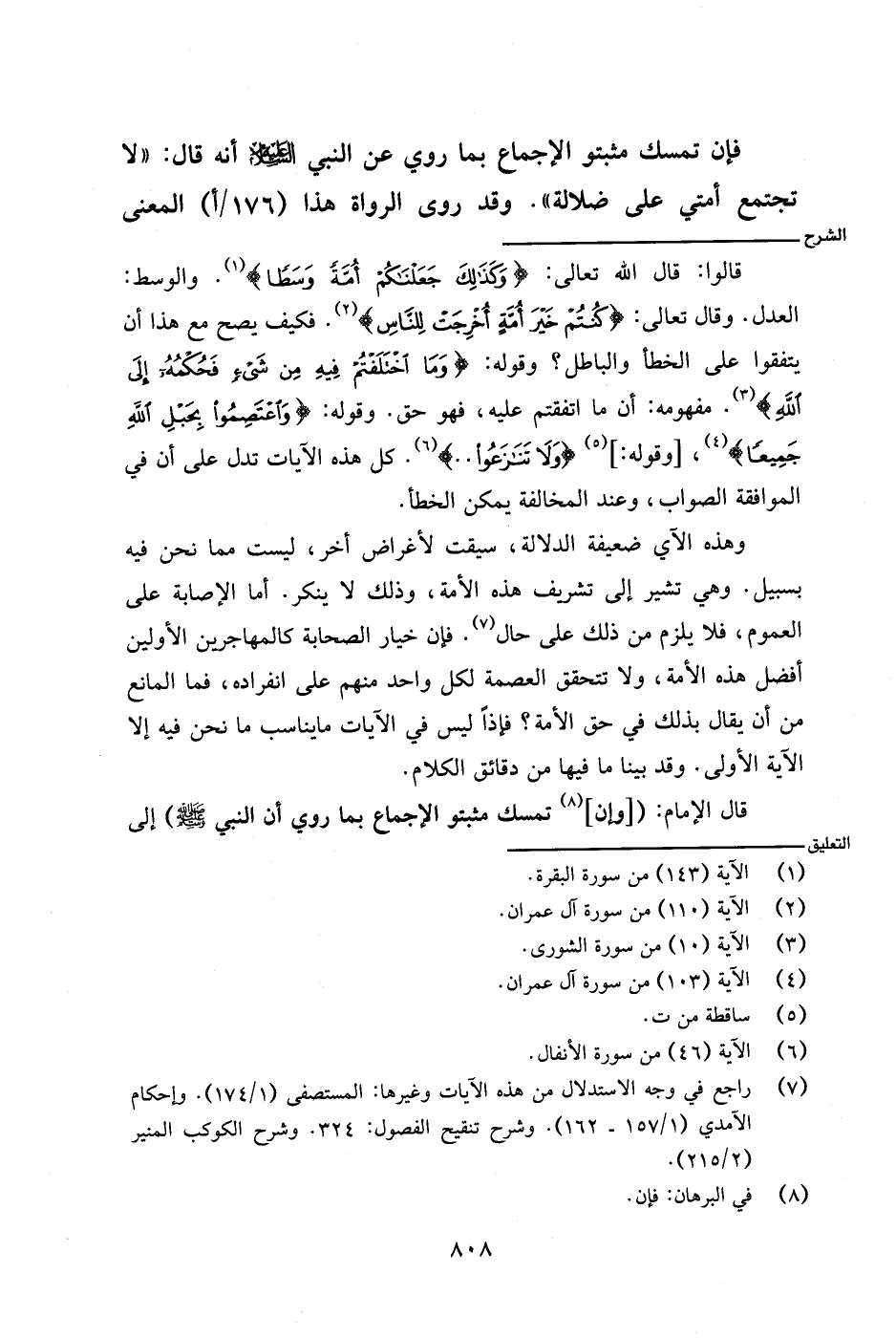 وهذه الآي ضعيفة الدلالة، سيقت لأغراض أخر، ليست مما نحن فيه بسبيل. وهي تشير إلى تشريف هذه الأمة، وذلك لا ينكر. أما الإصابة على العموم، فلا يلزم من ذلك على حال. فإن خيار الصحابة كالمهاجرين الأولين أفضل هذه الأمة، ولا تتحقق العصمة لكل واحد منهم على انفراده، فما المانع من أن يقال بذلك في حق الأمة؟ فإذًا ليس في الآيات ما يناسب ما نحن فيه إلا الآية الأولى. وقد بينا ما فيها من دقائق الكلام.