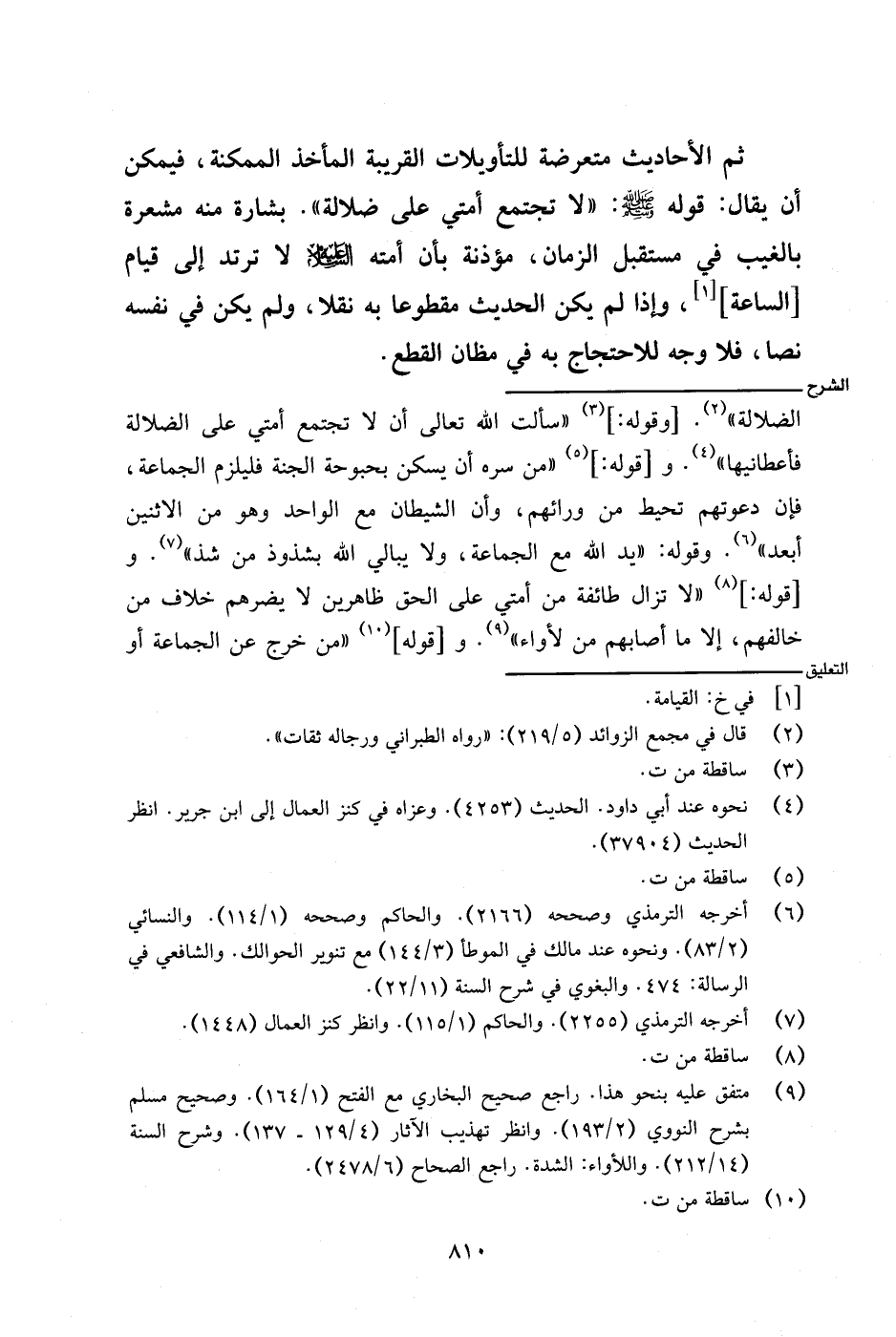 الضلالة). [وقوله: ] (سألت الله تعالى أن لا تجتمع أمتي على الضلالة فأعطانيها). و [قوله: ] (من سره أن يسكن بحبوحة الجنة فليلزم الجماعة، فإن دعوتهم تحيط من روائهم، وأن الشيطان مع الواحد وهو من الاثنين أبعد). وقوله: (يد الله مع الجماعة، ولا يبالي الله بشذوذ من شذ). و [قوله: ] (لا تزال طائفة من أمتي على الحق ظاهرين لا يضرهم خلاف من خالفهم، إلا ما أصابهم من لأواء). و [قوله] (من خرج عن الجماعة أو