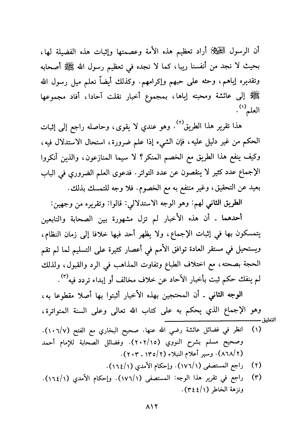 أن الرسول - عليه السلام - أراد تعظيم هذه الأمة وعصمتها وإثبات هذه الفضيلة لها، بحيث لا نجد من أنفسنا ريبا، كما لا نجده في تعظيم رسول الله - صلى الله عليه وسلم - أصحابه وتقديره إياهم، وحثه على حبهم وإكرامهم. وكذلك أيضًا نعلم ميل رسول الله - صلى الله عليه وسلم - إلى عائشة ومحبته إياها، بمجموع أخبار نقلت آحادا، أفاد مجموعها العلم.
