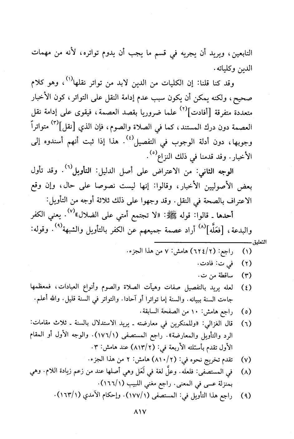 وقد كنا قلنا: إن الكليات من الدين لابد من تواتر نقلها، وهو كلام صحيح، ولكنه يمكن أن يكون سبب عدم إدامة النقل على التواتر، كون الأخبار متعددة متفرقة [أفادت] علما ضروريا بقصد العصمة، فيقوى على إدامة نقل العصمة دون درك المستند، كما في الصلاة والصوم، فإن الذي [نقل] متواترًا وجوبها، دون أدلة الوجوب في التفصيل. هذا إذا ثبت أنهم أسندوه إلى الأخبار. وقد قدمنا في ذلك النزاع.